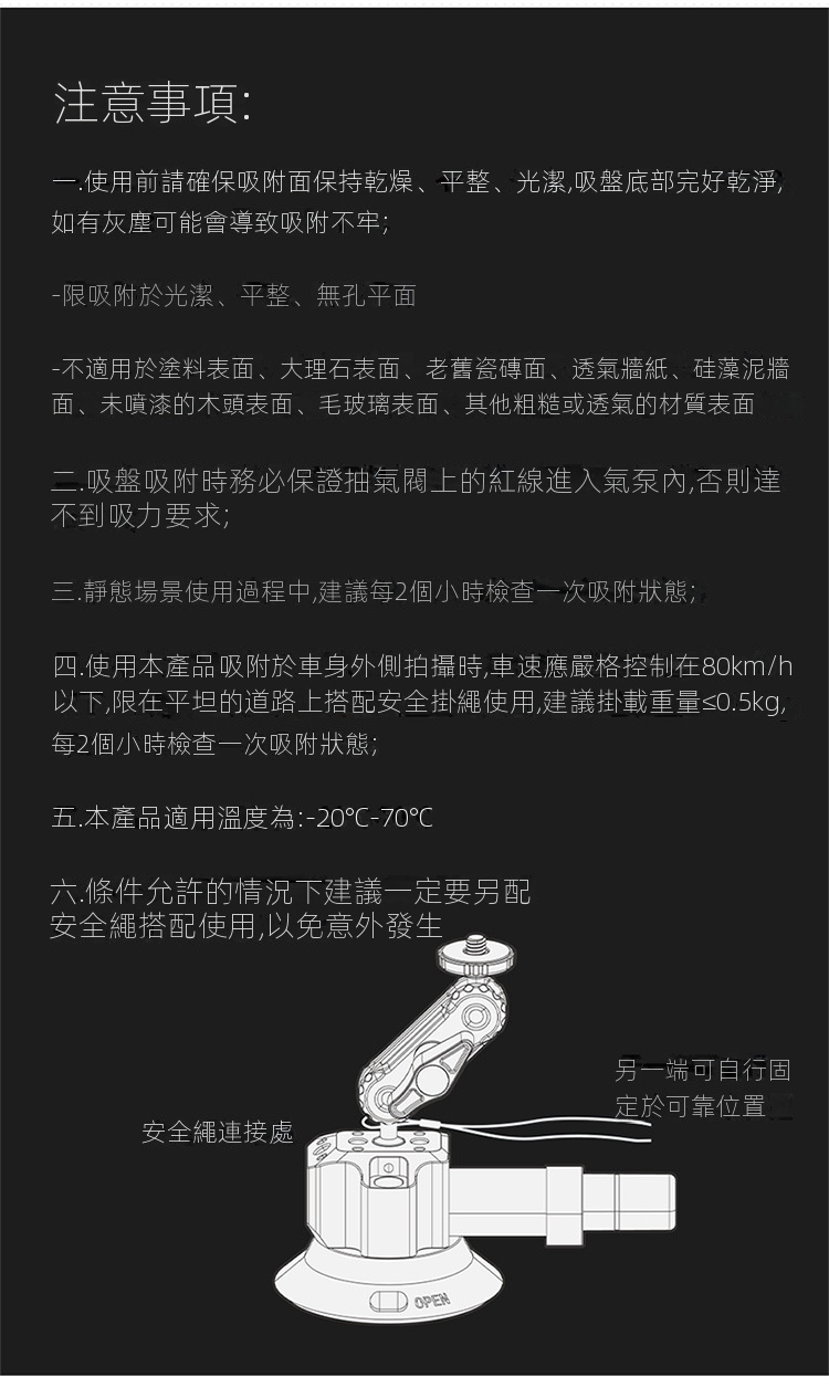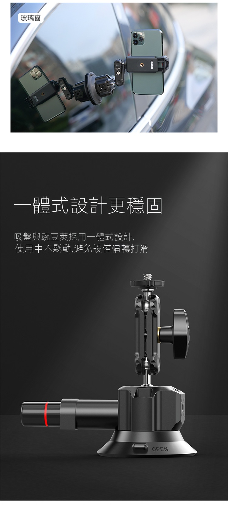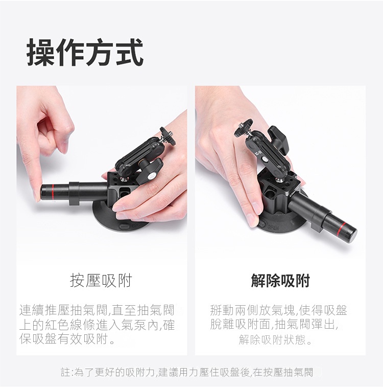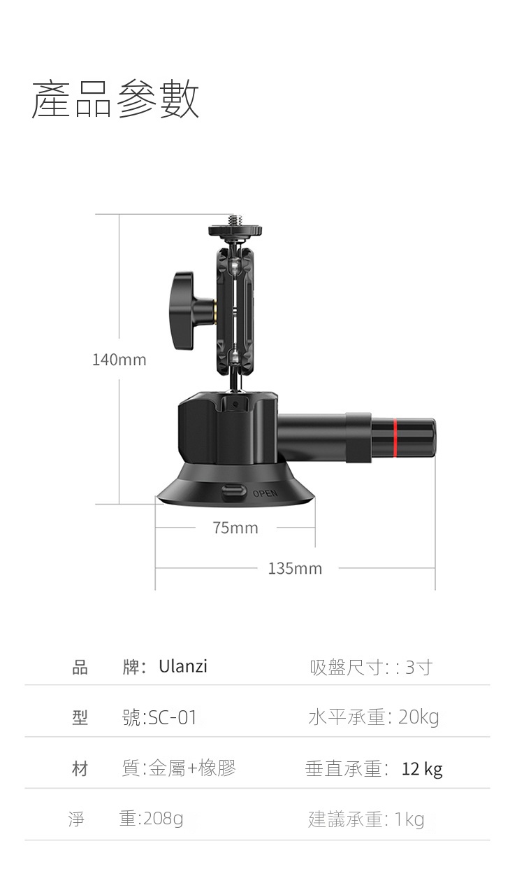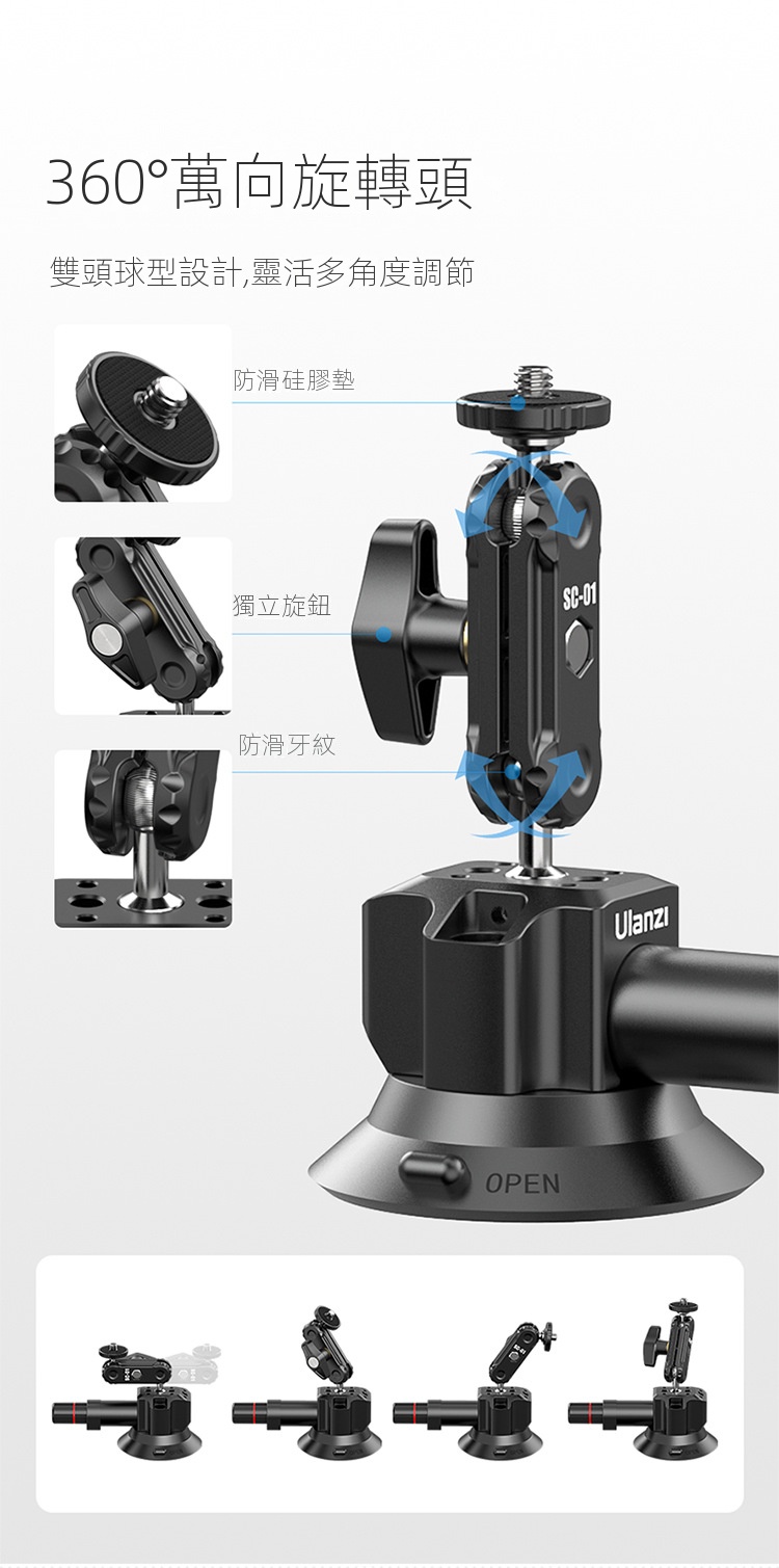 Ulanzi SC-01 3吋多拓展真空吸盤,是一款便利實用的拍攝輔助工具。它採用真空吸附原理,吸力強勁,能穩定吸附在車窗、玻璃等平滑表面,建議承重1kg,可滿足手機、運動攝影機等設備的拍攝需求。其自備手機夾與gopro轉接接頭,方便不同裝置安裝。而且具備多拓展功能,為攝影愛好者在車載拍攝、戶外記錄等場景中,提供了靈活多樣的拍攝角度選擇,解放雙手,助力輕鬆捕捉精彩瞬間 。