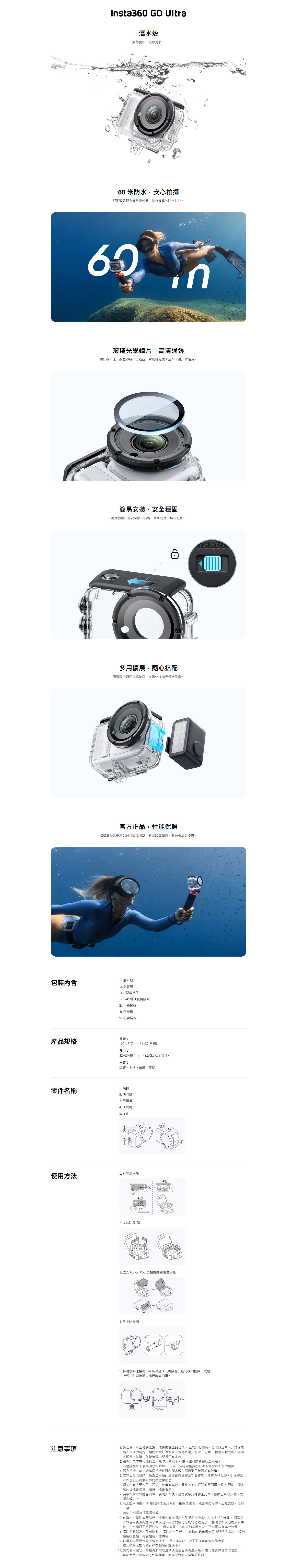 為你的 Insta360 GO Ultra 運動相機,提供專業級水下防護的Insta360 GO Ultra 潛水保護殼。此保護殼專為水下冒險設計,能提供深達60 米(約 197 英尺) 的防水性能,讓你安心進行深潛拍攝。其採用玻璃鏡頭,確保在水下環境中依然能獲得出色的影像畫質,並透過扣鎖結構與橡膠密封條雙重保護,將相機穩固密封於殼內。此外,保護殼頂部設計有通用冷靴支架,可方便連接補光燈等配件,滿足不同場景的拍攝需求。隨殼更附贈一個L 型轉接器,輕鬆切換垂直或水平拍攝角度,讓你的水下創作更加靈活多變。此配件是你探索海洋、記錄水下精彩瞬間的理想夥伴。
