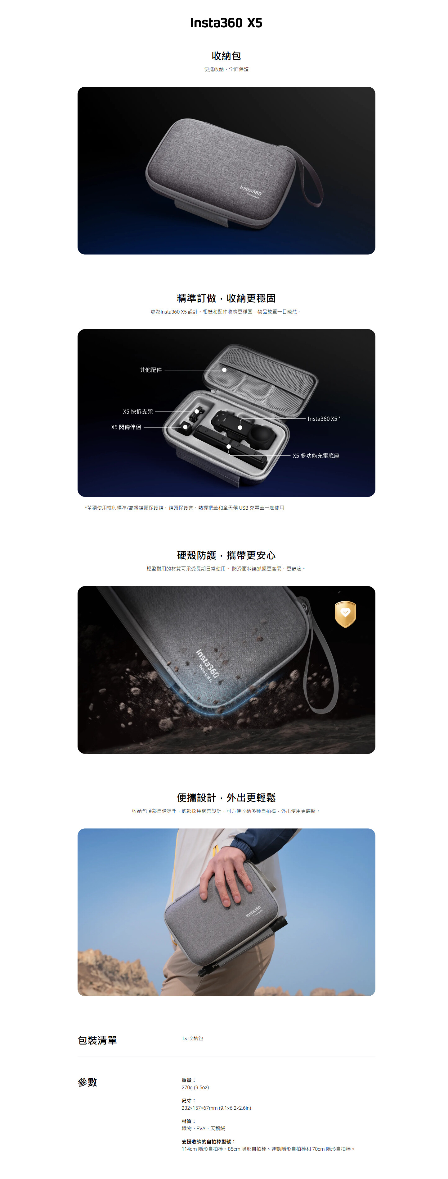 Insta360 X5 專用收納包是一款專為X5量身訂製的便攜收納方案,旨在為您的貴重設備與配件提供全面保護。此收納包採用織物、EVA與天鵝絨材質,重量僅270克,尺寸為232×157×67毫米,輕盈且耐用。其內部空間經過精準設計,無論X5相機是單獨使用,還是安裝了標準/高級鏡頭保護鏡、熱握把蓋等配件,均可穩固貼合收納。包內同時能妥善收納多功能快速充電盒、閃傳伴侶等多樣原廠配件。設計上,收納包具備硬殼防護結構與防滑面料,頂部設有提手,便於攜帶。更特別的是,包身底部設計了綁帶,可方便地固定114厘米、85厘米等型號的隱形自拍棒,並附有一條用於固定自拍棒的安全帶,讓您外出創作時更加輕鬆安心。