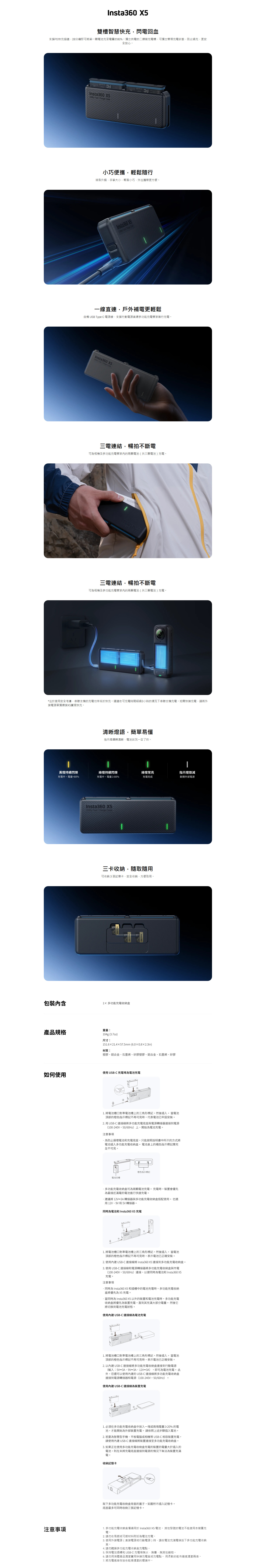 專為Insta360 X5設計的多功能充電收納盒,集快速充電、安全收納與便捷供電於一身。它採用PD快充技術,僅需28分鐘即可將電池電量充至80%,大幅提升續航效率。其設計小巧纖薄,便於攜帶,並內建USB-C連接線,可直接連接行動電源,實現戶外隨行充電。它可同時為三顆電池充電:收納盒內的兩顆及相機中的一顆,確保拍攝不間斷。此外,它還內建三卡位,能安全收納三張記憶卡,並可作為手機或平板電腦的緊急備用電源,是X5用戶高效、安心創作的理想配件。