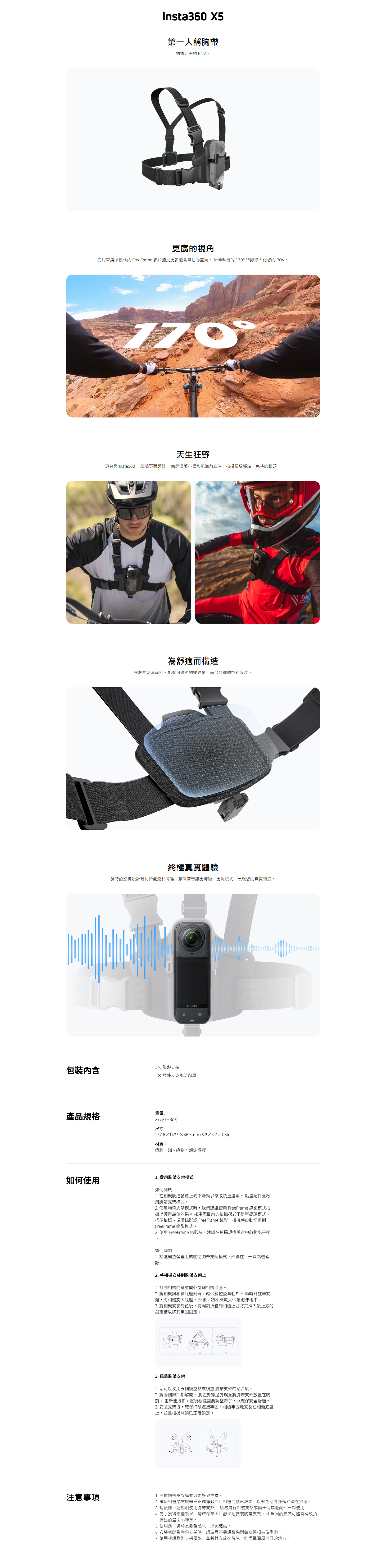 Insta360 X5第一人稱胸帶是一款專爲運動拍攝設計的配件,旨在解放您的雙手,捕捉身臨其境的第一人稱(POV)視角影片。它專爲X5相機打造,尤其適合登山單車、越野摩托車等激烈運動,能提供穩定可靠的拍攝效果。該胸帶採用輕巧、可調節且防滑的設計,確保佩戴安全舒適。其獨特的結構設計有利於氣流和降噪,即使在高速運動中也能錄製清晰的音訊。使用時,結合相機的單鏡頭FreeFrame模式,可以獲得超廣170°的視野,最大化您的POV畫面,將車把等更多場景收入鏡中。對於追求終極真實體驗的運動愛好者而言,這款胸帶是獲取獨特第一人稱視角的理想工具。