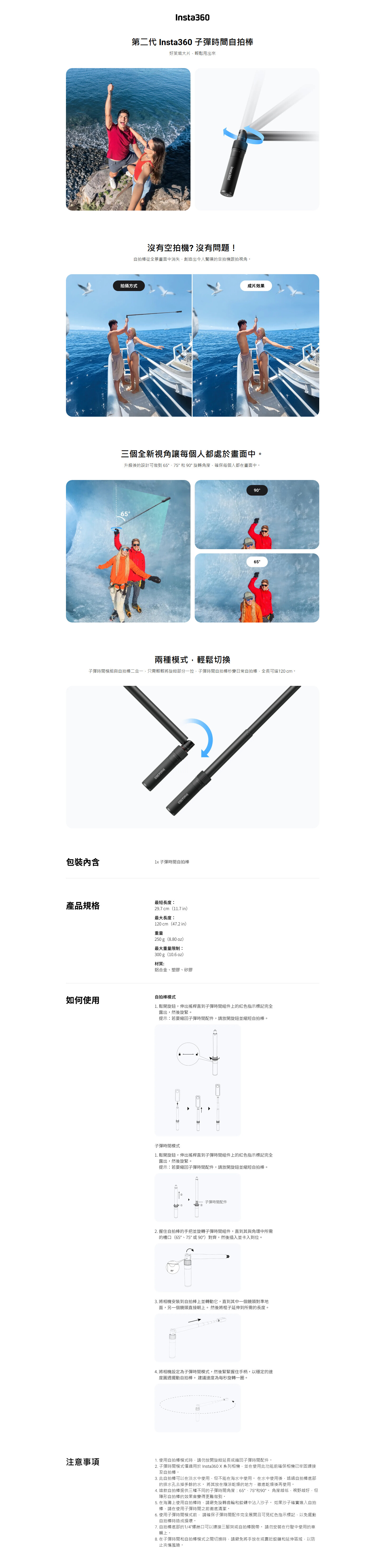 Insta360 子彈時間自拍棒 2 是一款能輕鬆創造好萊塢風格環繞鏡頭的創意拍攝配件。只需揮動它,即可拍攝出電影般的「子彈時間」特效。它集子彈時間配件與自拍棒功能於一身,無需額外配件即可切換模式,非常方便。自拍棒提供 65°、75° 和 90° 三種拍攝角度,並可延長至 120 公分,能輕鬆獲取獨特視角並進行多人合照。當與 Insta360 系列全景相機(如 X5、X4、X3、ONE RS 等)搭配使用時,自拍棒會在畫面中自動隱形。其底部還設有一個 1/4 吋通用安裝點,進一步提升了擴展性。這款自拍棒是 Insta360 經典配件的全新演繹,讓創意拍攝變得更加簡單有趣。