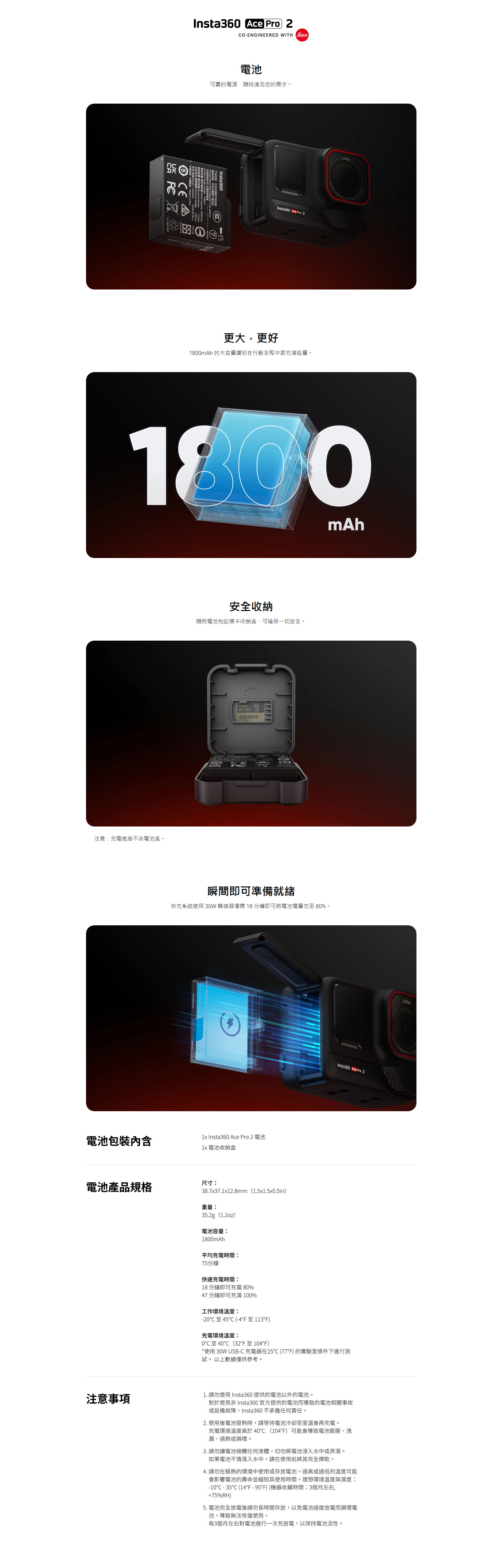此款原廠電池專為 Insta360 Ace Pro 2 設計,擁有1800mAh容量,採用快速充電技術,能為您的運動相機提供持久穩定的拍攝電力。為方便攜帶與保護,產品隨附專用收納盒,可安全存放電池。它是確保您不錯過任何精彩瞬間、隨時進行電力補充的必備配件。