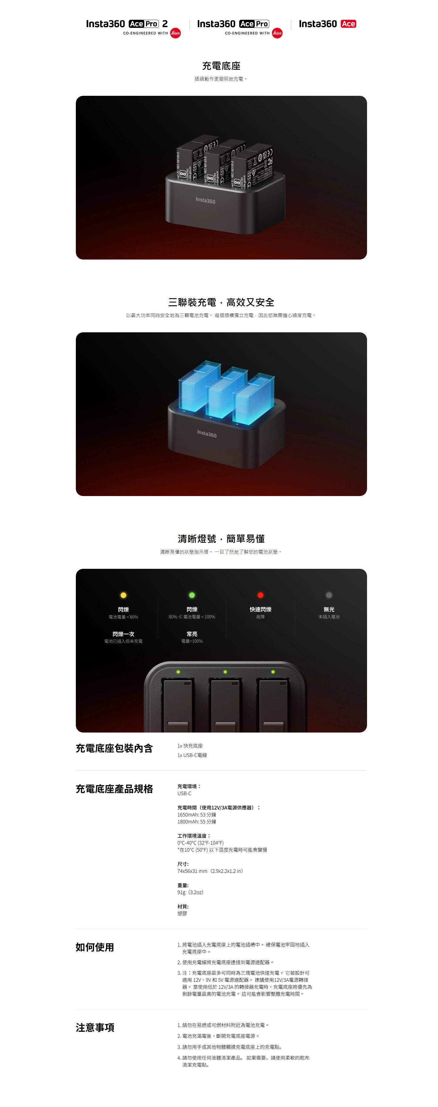 Insta360 Ace 系列專用充電底座是專為 Ace Pro 2、Ace Pro 及 Ace 相機設計的高效充電配件。它能夠同時為最多三顆電池進行快速充電,並內建智慧充電管理系統,提供過充保護以確保電池安全與壽命。此充電底座採用緊湊設計,便於收納和攜帶,能與原裝電池完美匹配,簡化了多電池的充電流程,大幅提升了拍攝工作的連續性與效率,是 Ace 系列相機用戶的理想選配工具。