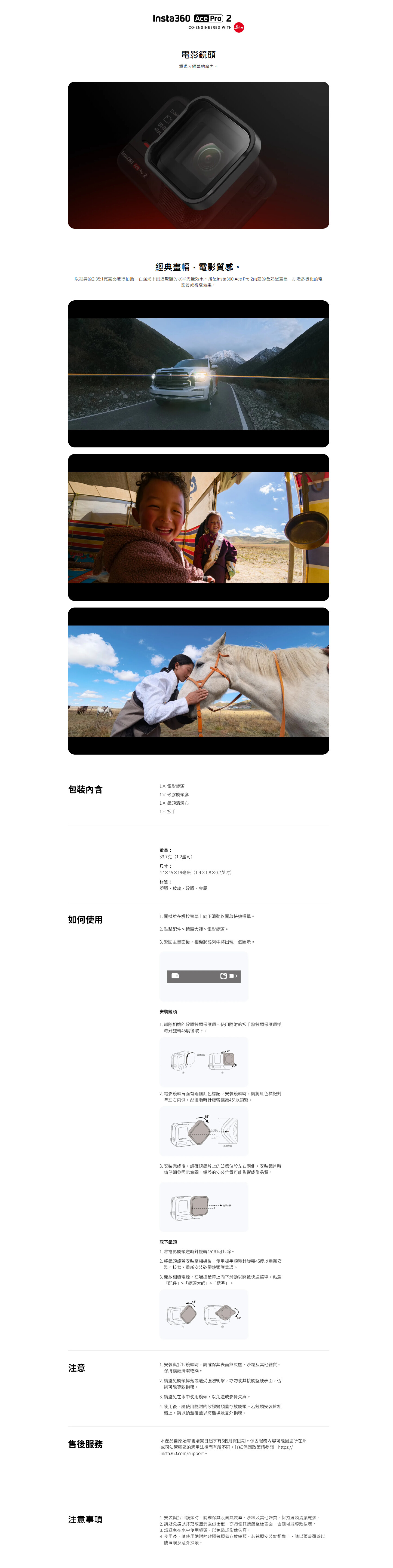 Insta360 Ace Pro 2 電影鏡頭是一款專為Insta360 Ace Pro 2相機設計的專用配件。它能讓相機以標誌性的2.35:1電影級寬高比進行拍攝,輕鬆重現大銀幕的獨特視覺魅力與電影敘事感,為畫面賦予濃郁的戲劇氛圍。使用前,請務必將您的Ace Pro 2相機韌體及Insta360應用程式升級至最新版本,以確保獲得完整的功能支持與最佳拍攝體驗。