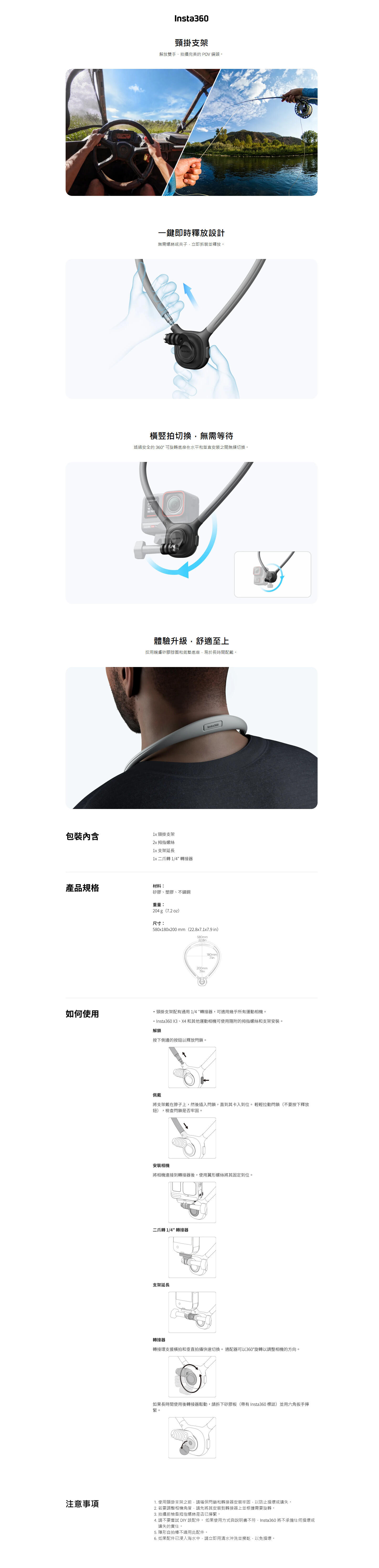 Insta360 頸掛支架是一款專為免持拍攝設計的配件,能讓使用者輕鬆捕捉第一人稱視角。它採用一鍵式鎖定機制,可快速固定或拆卸相機。其底座支援360度旋轉,能在水平和垂直拍攝模式間自由切換。支架本身使用了柔韌親膚的矽膠材質,並配備氣墊底座,提升了長時間佩戴的舒適度。此產品廣泛兼容包括X4、X3、Insta360 Ace系列、GO 3S等多款Insta360相機,用途靈活,是日常記錄和運動拍攝的實用工具。