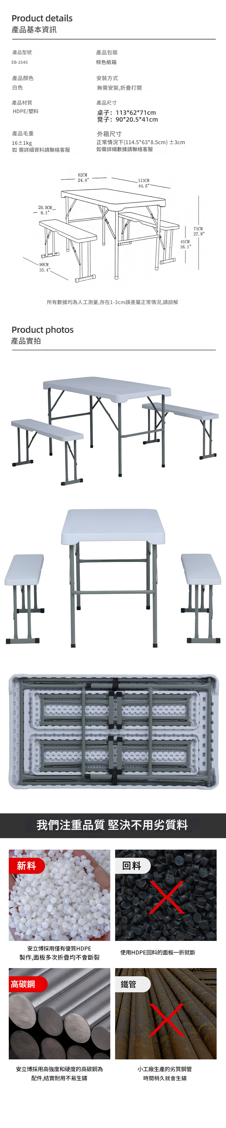 輕便戶外餐桌凳組合設計緊湊輕巧,易於收納。採用優質HDPE新料與高碳鋼製成,確保耐用且不易生鏽。面板多次折疊不會斷裂,堅固可靠。適合野餐、露營等戶外活動,提供舒適的用餐與休息體驗。