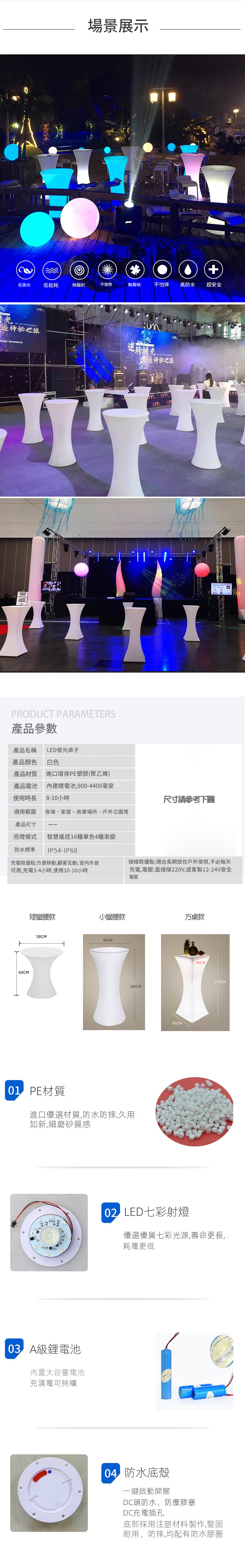 這款戶外吧台桌採用進口環保PE塑料製成,質感細磨砂,防水防摔且耐用。桌子內置大容量鋰電池,充滿電後可持續使用8-10小時,適合夜場、家居、商業場所及戶外公園等多種場合。LED七彩射燈提供16種單色和4種漸變模式,智能遙控操作簡單便捷,燈光柔和不傷眼。產品具備長壽命、無輻射、不發熱、無異味的優點,並配有一鍵啟動開關和防水防塵設計,確保戶外使用的安全性與穩定性。無論是餐廳還是酒吧,這款吧台桌都能為您創造出獨特的氛圍。