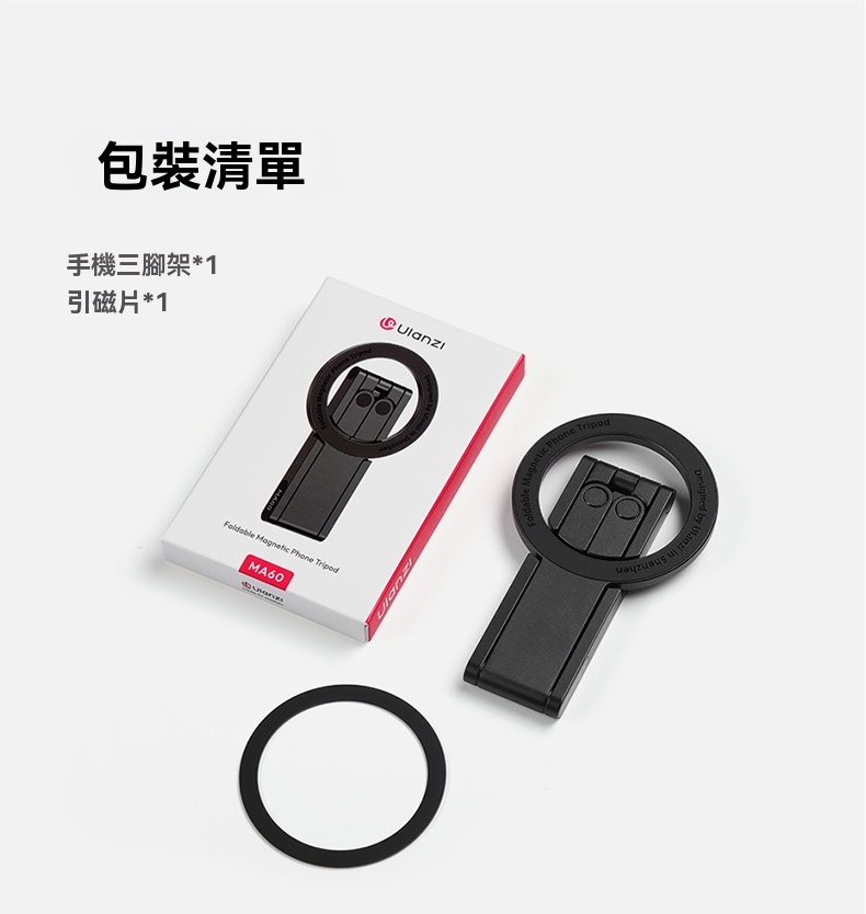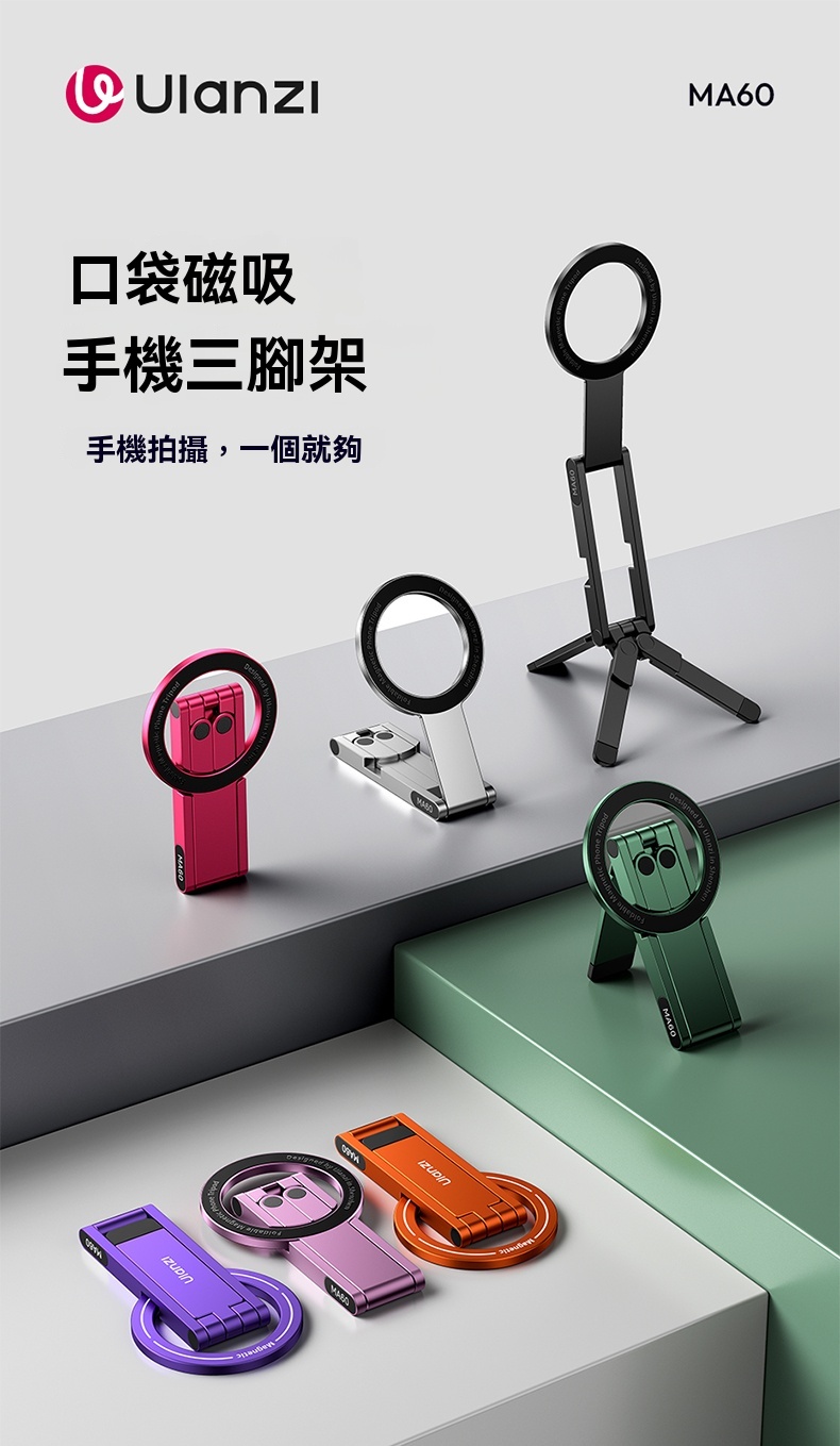 想要隨時隨地記錄生活,卻總被笨重的拍攝裝備束縛?別擔心,ULANZI MA60口袋磁吸手機腳架來解救你啦!它僅重70g,折疊後尺寸小巧,能輕鬆放入口袋或掛在包包上,讓你出行無負擔。其採用高品質鋁合金材質,堅固耐用,強力磁吸設計可牢固吸附手機,即使6.7寸的xs max也能平穩支撐,橫豎屏拍攝隨意切換。腳架角度可靈活調節,無論是低角度拍攝萌寵,或是高角度俯拍風景,都能滿足你的創意需求。而且它不僅適用於iPhone蘋果magsafe,搭配附贈磁吸環,安卓手機也能輕鬆適應。有了它,記錄美好變得超簡單!