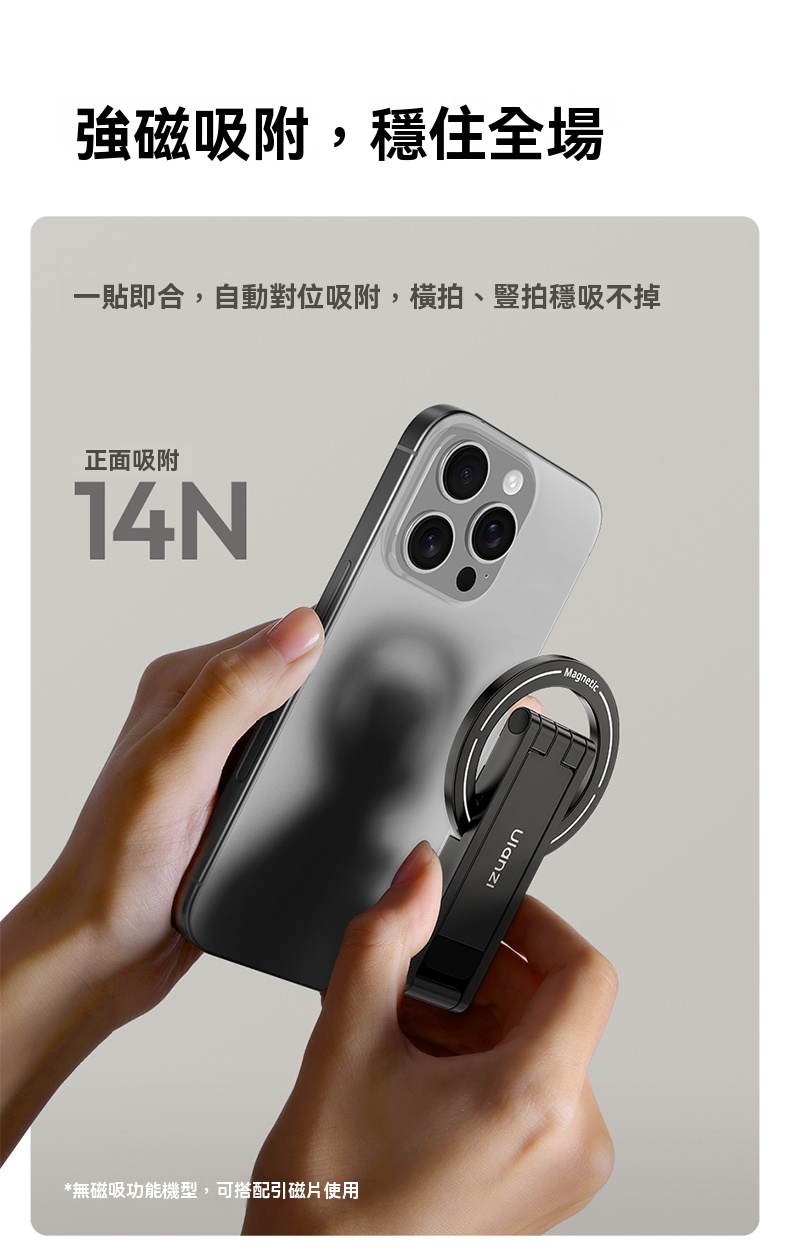 • 強力磁吸:採用強磁設計,可牢固吸附手機,即便是 6.7 吋的 xs max 也能平穩支撐,橫豎屏切換輕鬆,且雙面磁吸功能還能吸附補光燈等配件。