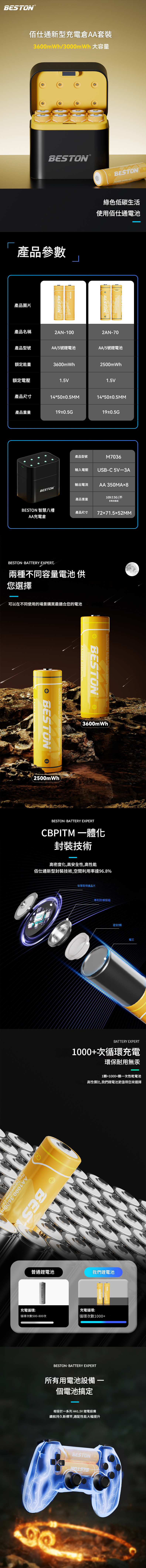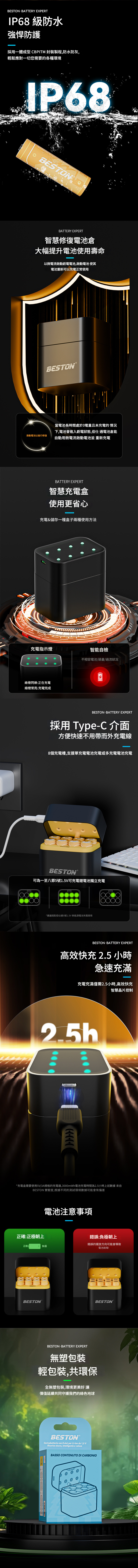Beston 智慧LED燈顯 type-c AA 鋰電池充電器套裝 - 3600mWh (8粒裝連充電器) | 1000+次循環充電 | IP68防水等級
