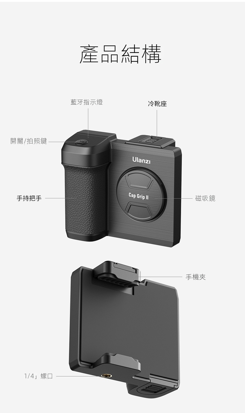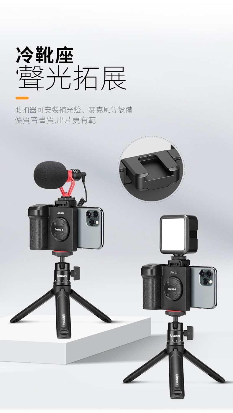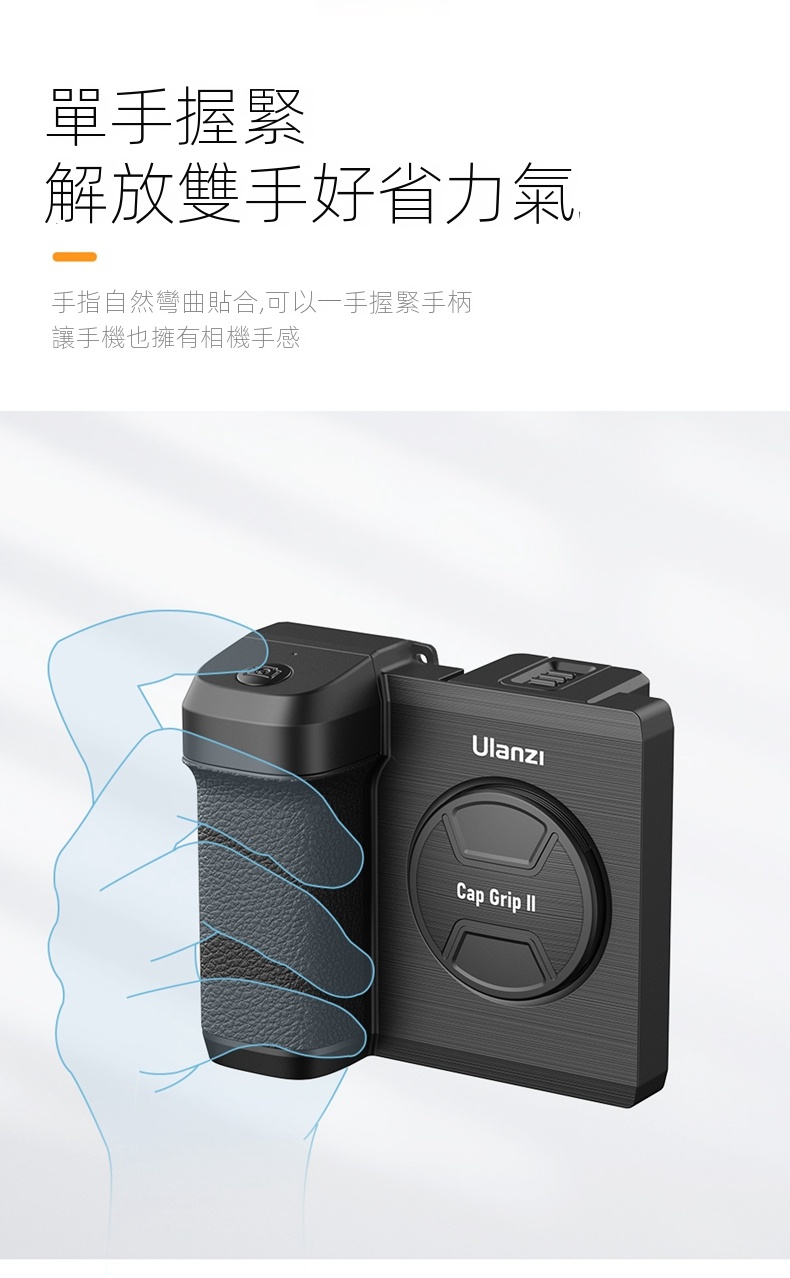 Ulanzi CG01 藍牙手機助拍器是一款專為移動攝影設計的多功能輔助設備。其採用仿相機專業設計,增加握持配重,有效防抖動,確保移動拍攝時畫面穩定。單手握緊即可解放雙手,提供輕鬆省力的使用體驗,同時帶來類似相機的手感。 該產品內置磁吸式圓形小鏡,可作為補妝鏡使用,隨時調整妝容。此外,還配備了磁吸式藍牙遙控器,支持30米遠距離遙控拍照,讓用戶在自拍或合照時更加靈活方便。冷靴座設計則允許安裝補光燈、麥克風等外設,提升音畫品質,滿足多樣化攝影需求。 CG01輕巧便攜,適合隨身攜帶,且內部配有Type-C充電接口和USB-A轉接線,方便外出時進行充電。產品結構精巧,包括手持把手、開關/拍照鍵、冷靴座及磁吸鏡等功能模塊,並預留腕帶孔位,進一步增強實用性與舒適度。