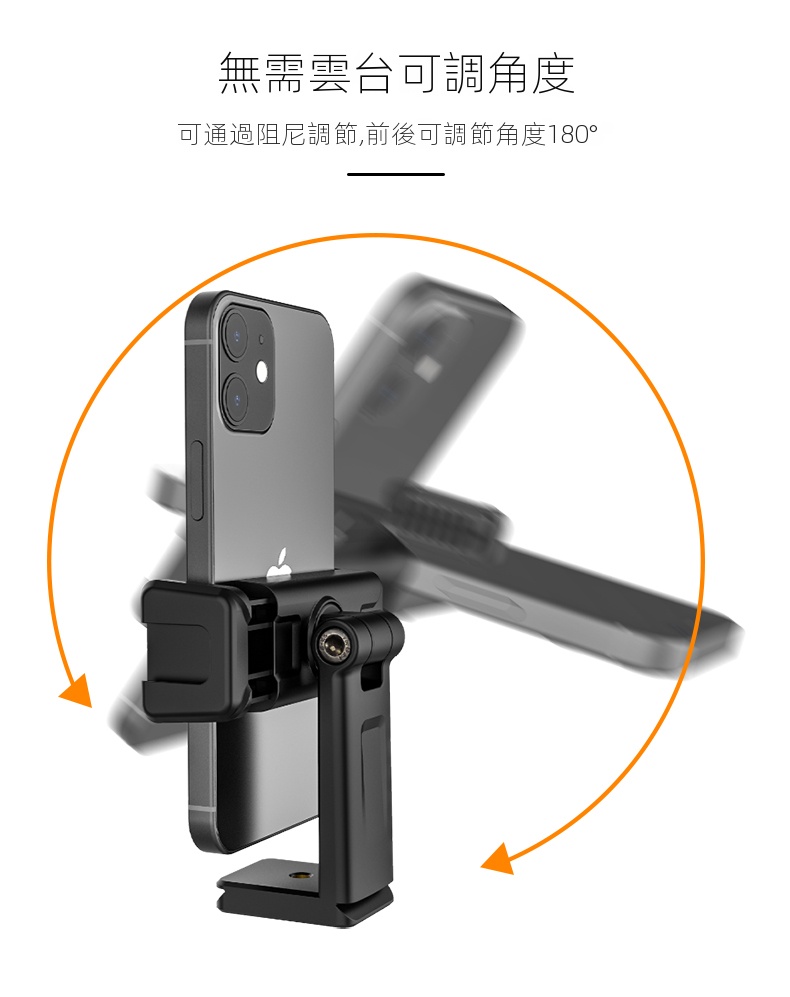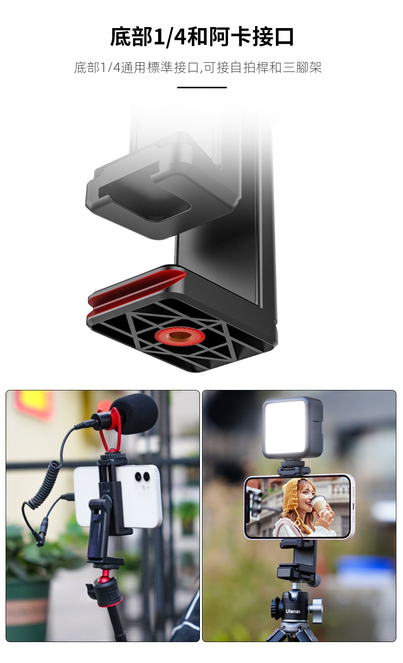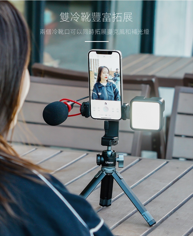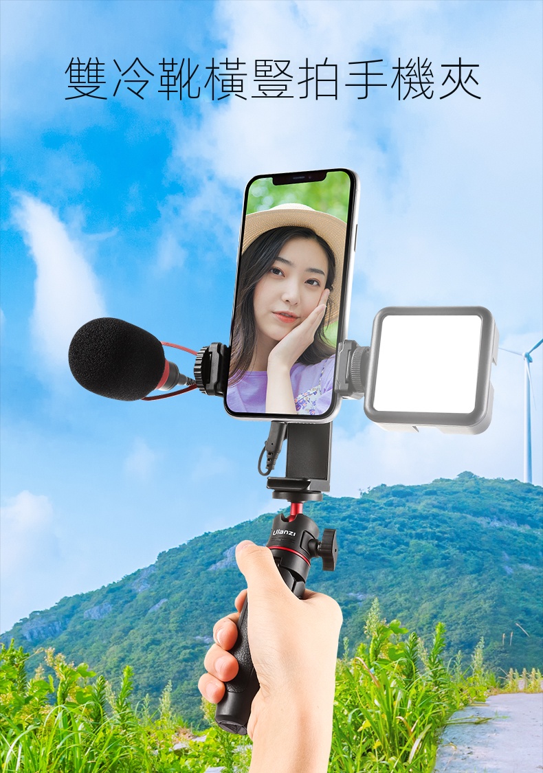 這款 Ulanzi 橫豎拍手機夾是專為行動攝影愛好者設計的多功能配件。它採用輕便小巧的設計,僅重 46 克,方便攜帶,適合各種戶外和室內場景使用。產品支持 360°旋轉,可靈活調整角度,滿足橫豎屏拍攝需求,適用於大多數市面手機(手機夾範圍為 55-87mm)。 該手機夾配備雙冷靴接口,可同時連接麥克風和補光燈,提升錄影品質。底部配有 1/4 和阿卡接口,兼容自拍杆和三腳架,擴展性強。此外,手機夾還具備阻尼調節功能,前後可調節角度達 180°,確保穩定性和舒適性。