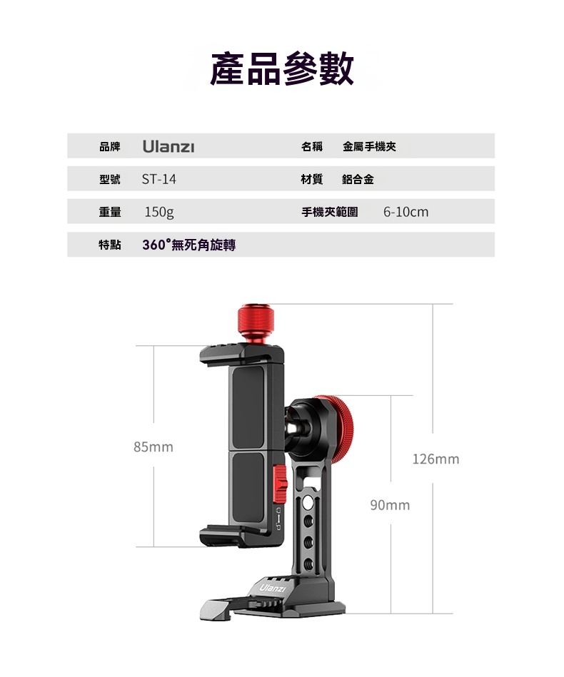 Ulanzi ST-14 金屬手機夾是一款專為行動攝影設計的多功能裝置,兼具堅固耐用與靈活多變的特性。採用全金屬材質,確保耐用性與穩定性,適合長期使用。其360°無死角旋轉雲台設計,可自由調整角度,滿足俯拍、橫拍、豎拍及斜拍等多種需求,讓用戶輕鬆捕捉不同視角的精彩瞬間。 該產品配備創意隱藏式桌面支撐腿,無需三腳架即可穩固放置於桌面,並具備磁吸掛扣功能,方便收納與攜帶。手機夾最大寬度可達10公分,兼容絕大多數市售手機,適用範圍廣泛。此外,底部設有冷靴口,可固定麥克風或攝影燈,進一步提升錄影品質。 ST-14還擁有標準阿卡快裝口,支持快速安裝,並可搭配三腳架使用,提供更專業的攝影體驗。整體設計精巧實用,無論是日常錄影還是專業創作,都能滿足用戶的需求,是行動攝影愛好者的理想選擇。