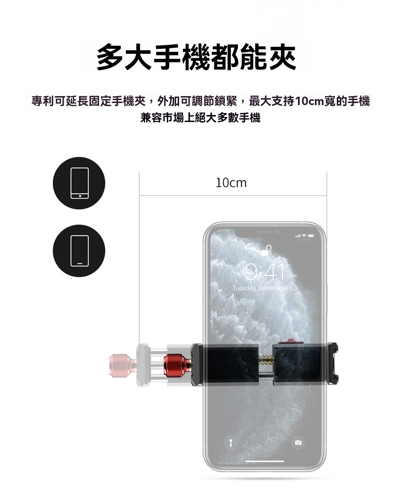 • 手機夾範圍廣泛,最大寬度達10公分,兼容絕大多數手機
