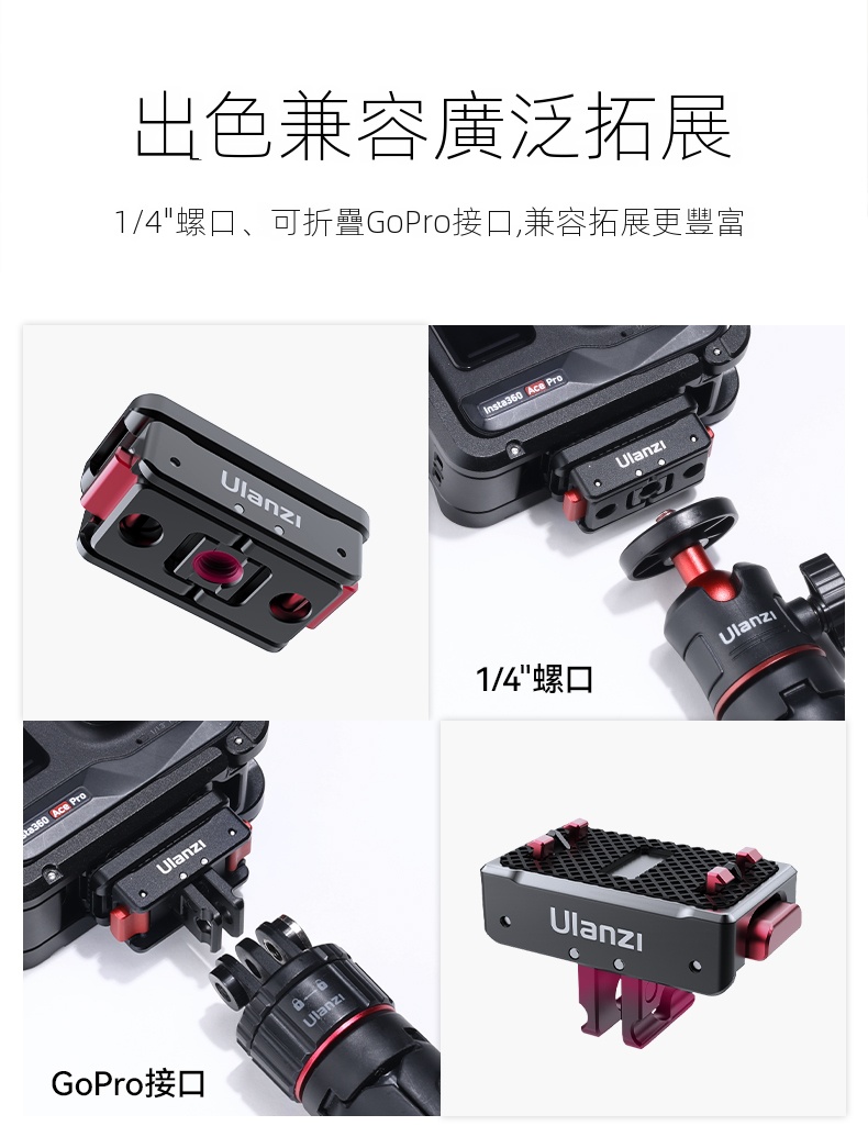 • 出色兼容性,支持 1/4" 螺口及可折疊 GoPro 接口