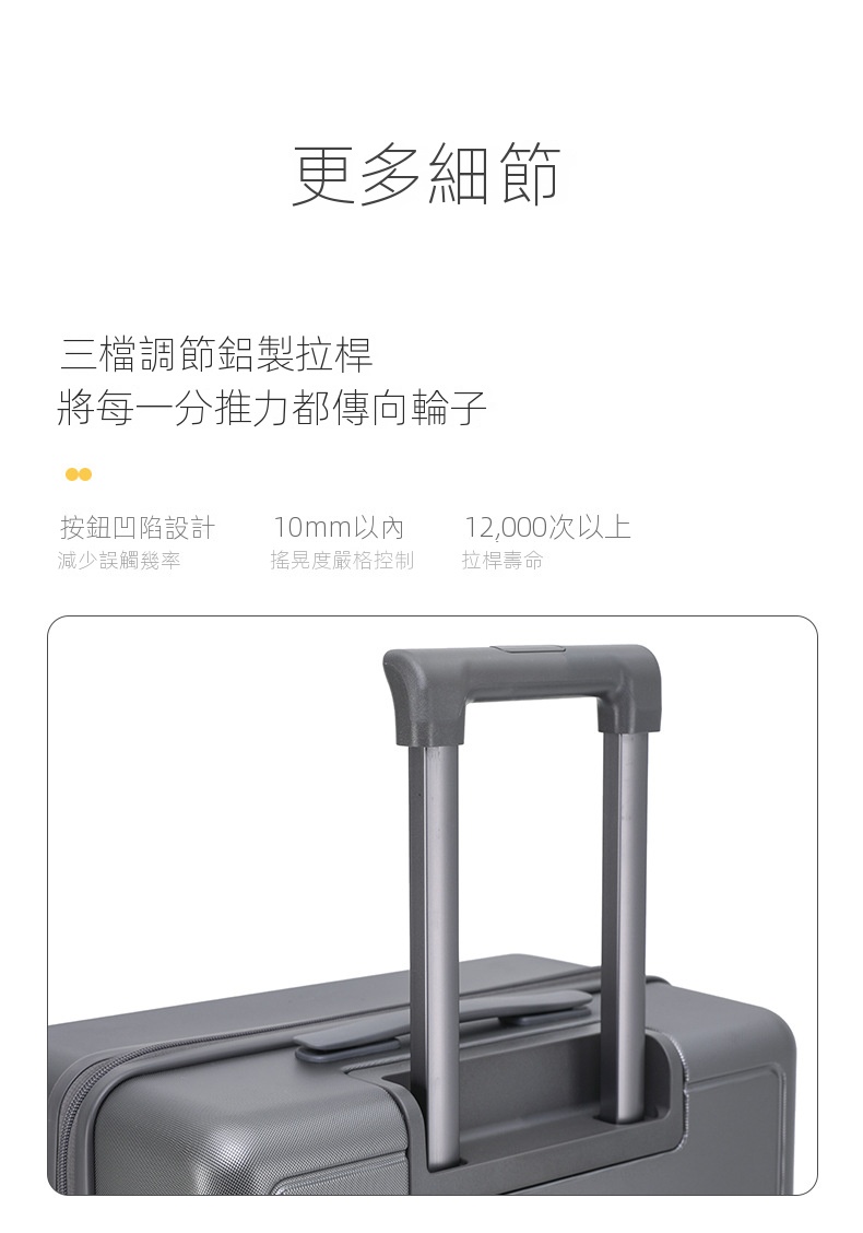 高品質男女通用PC旅行箱,擁有三七收納分區,空間利用極致。採用德國科思創PC材質,堅韌耐用,不易開裂。配備三檔調節鋁製拉桿,推行輕鬆省力。TSA國際認證密碼鎖,確保行李安全。後置水杯架解放雙手,側面站腳保護箱面。多種細節設計,伴您暢遊世界。