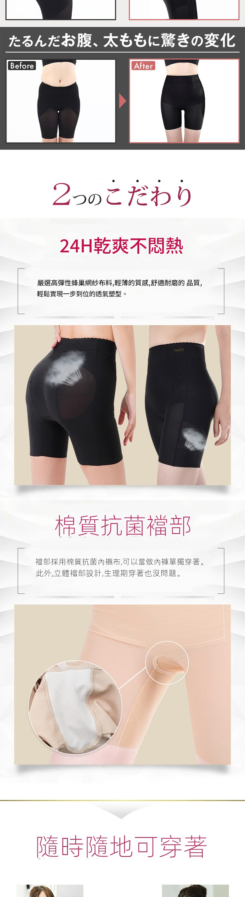 • 加寬加厚腰帶,避免捲邊勒肉問題。
