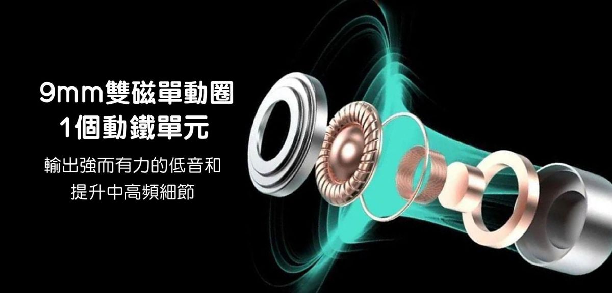 • 驅動器:1 個動態驅動器 9mm+1個 BA