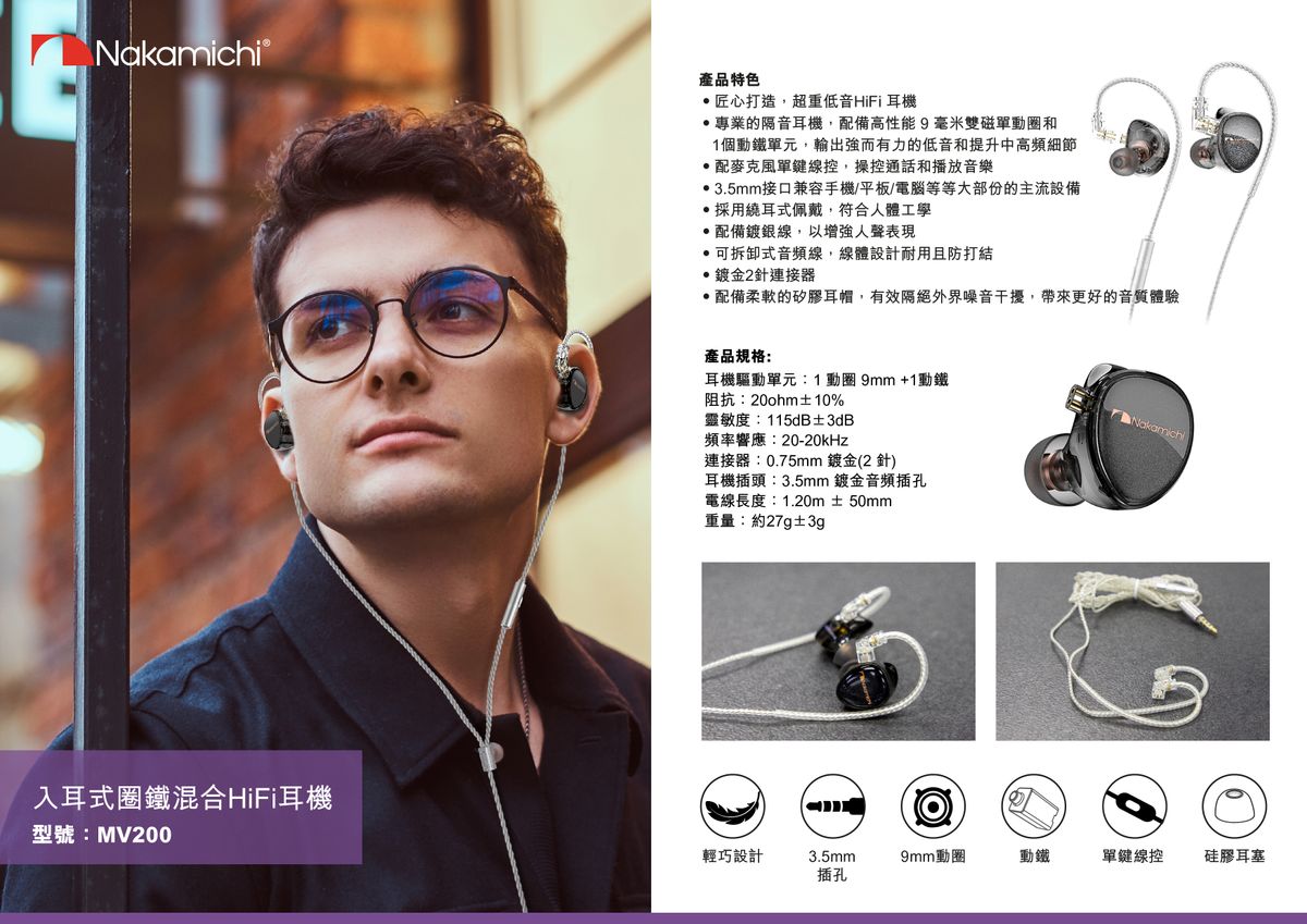 NAKAMICHI MV200 是一款主打精準音質的混合雙驅動入耳式監聽耳機,依託品牌 70 餘年在聲學領域的技術積累打造。其核心優點在於混合雙驅動單元配置,能細膩還原高中低頻音效,實現清晰通透的音質表現,精準捕捉聲音細節,滿足專業監聽需求。設計上貼合人體工學,搭配不同尺寸耳塞套,配戴穩固舒適,適合多樣耳部輪廓。同時支援實用功能,兼顧日常聽音與專業場景。作為專注音響設備的品牌力作,MV200 以專業表現與穿戴體驗,成為音樂愛好者與需求人群的可靠選擇。
