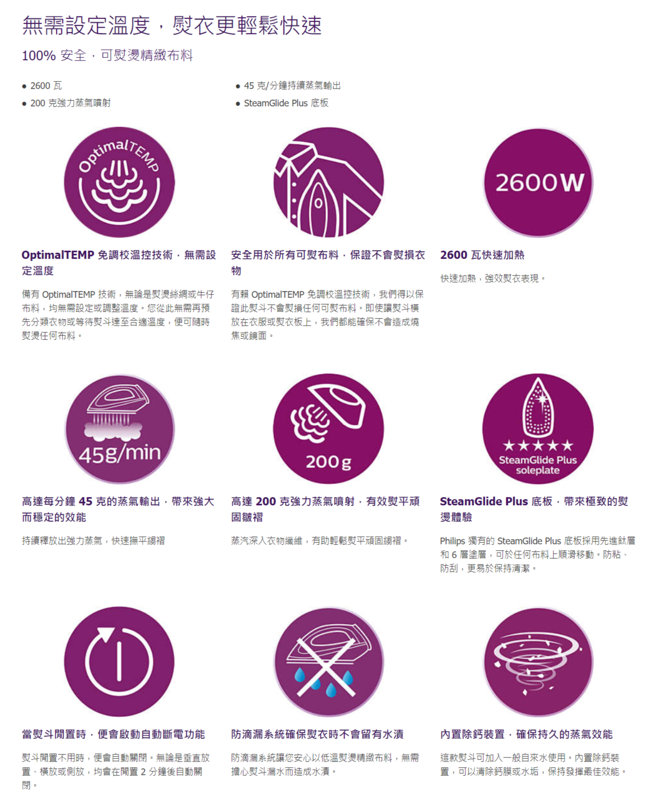 Philips GC3929 PerfectCare Powerlife免調校蒸氣電熨斗,功率達2600瓦 ,持續蒸氣輸出為45克/分鐘,可高效去除衣物褶皺。其200公克強力蒸氣噴射,可快速對付頑固深層褶皺。它搭載OptimalTEMP智慧溫控技術,以智慧晶片取代傳統溫度設定,一個最佳設定適用於從牛仔佈到絲綢等各種面料,保證不燙焦衣物,無需手動調節。蒸氣順滑陶瓷底板帶有按鈕凹槽,滑動順暢,垂直蒸氣功能可像使用掛燙機一樣,輕鬆處理懸掛衣物或窗簾褶皺,還有自動斷電等貼心設計,為日常熨燙帶來便捷與高效。