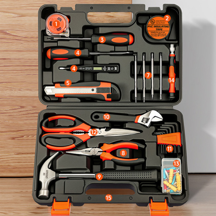 • 實用25件套:捲尺, 電工膠帶, 一字起子, 十字起子, 數顯測電筆, 美工刀, 螺絲起子批桿頭*4, 尖嘴鉗, 羊角鉗, 活動扳手, 內六角扳手*8, 家用剪刀, 螺絲零件, 螺絲起子手柄, 工具箱