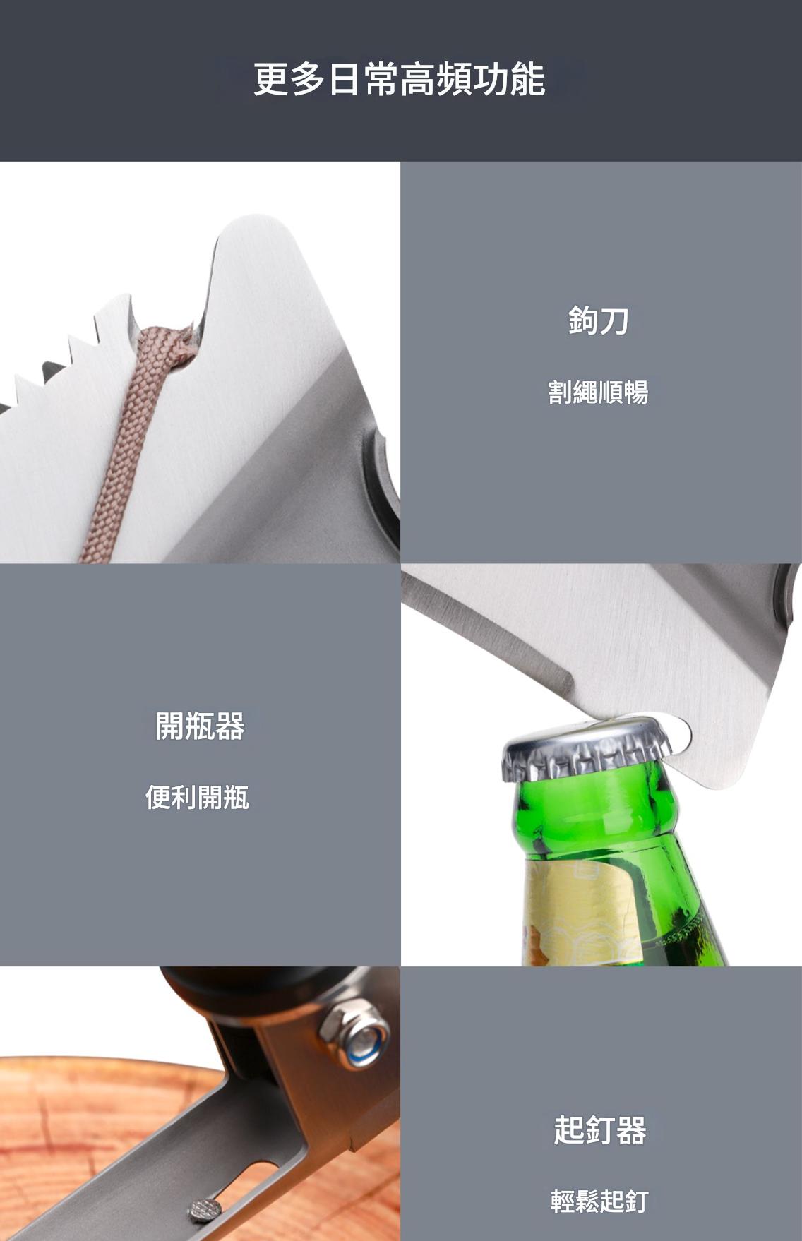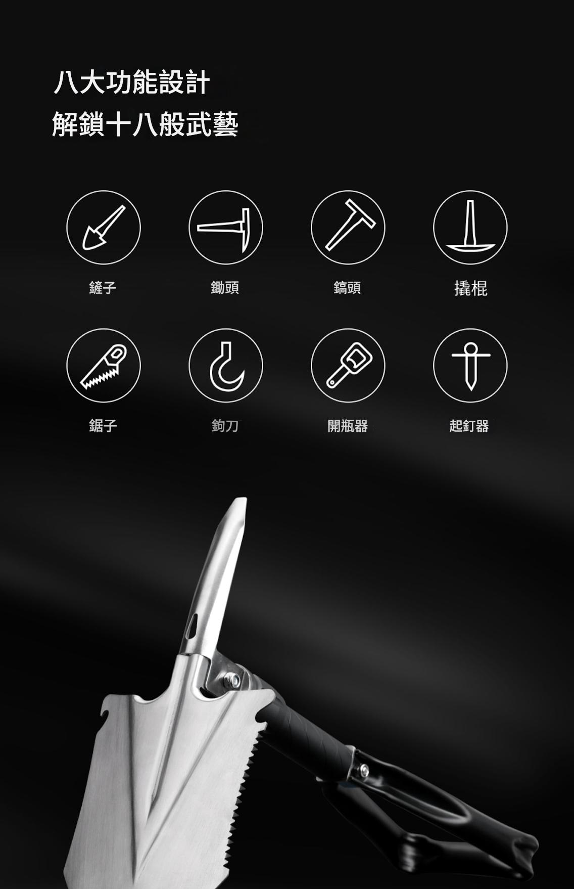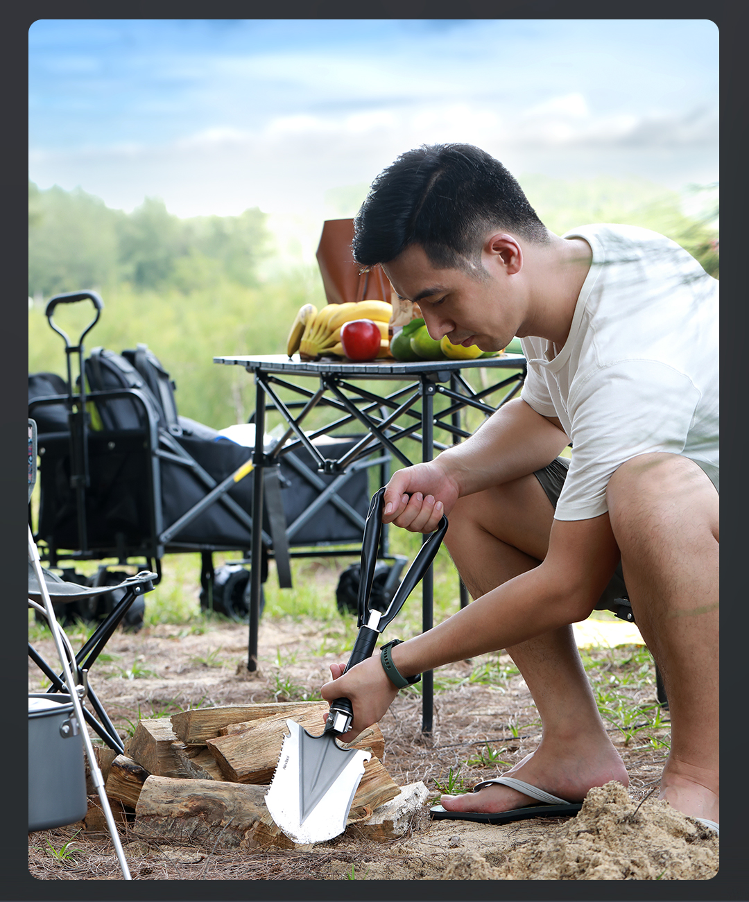 • 功能整合度高:集錘、鏟、鋤、斧頭、刀、鋸六種功能於一體,滿足使用者在露營、釣魚、園藝等多種場景下的使用需求,無需攜帶多種工具。