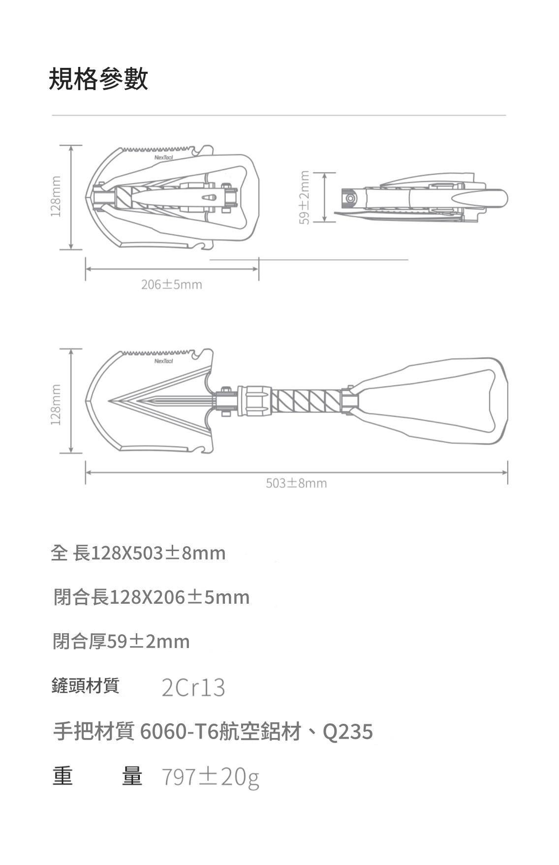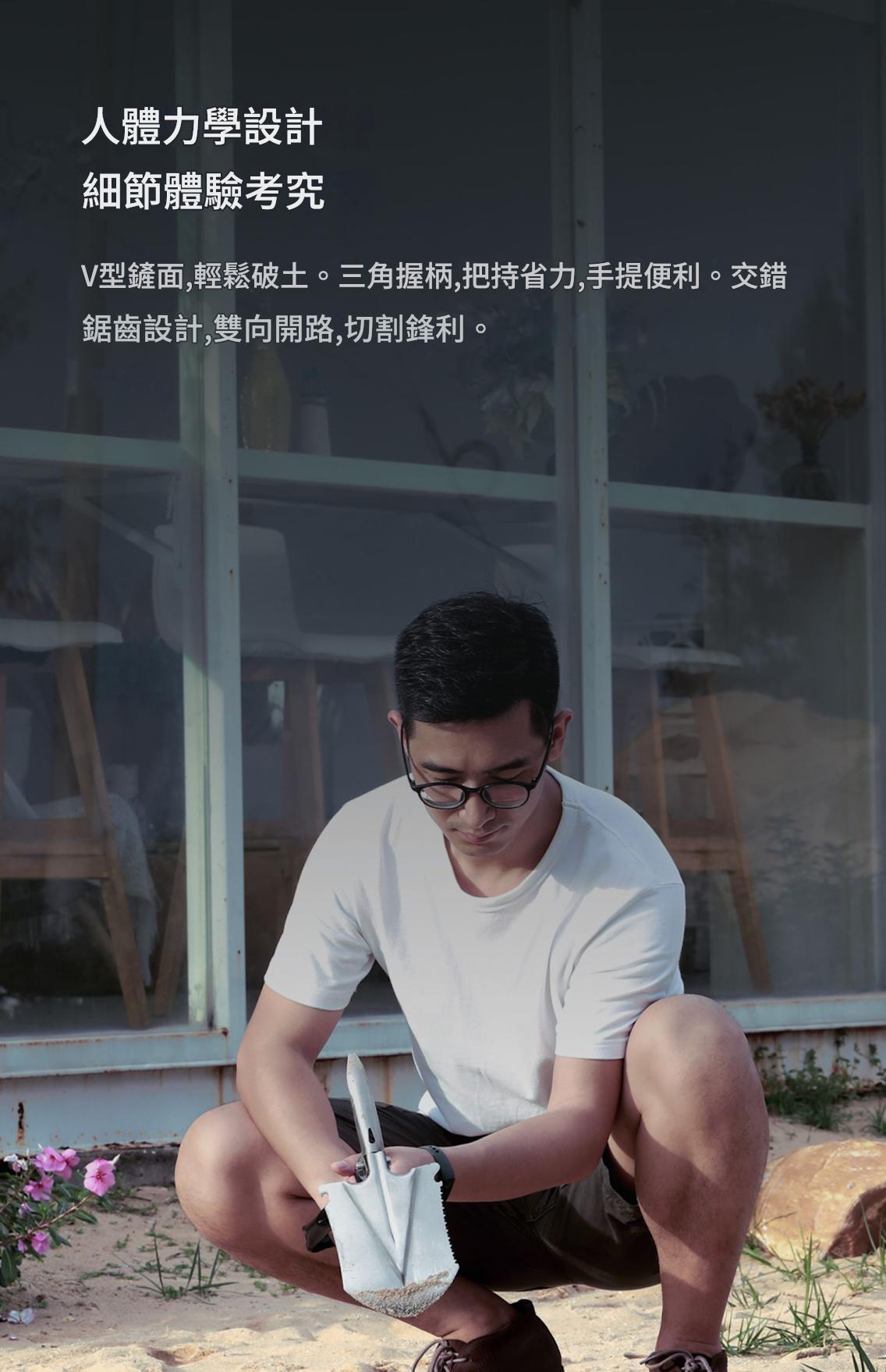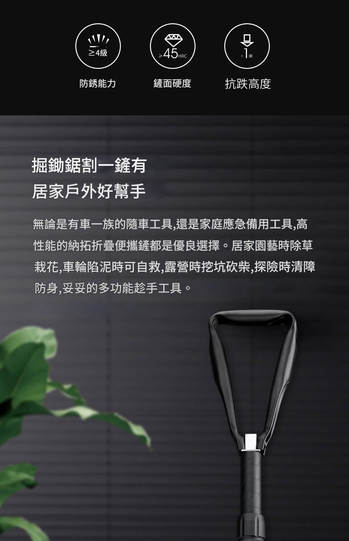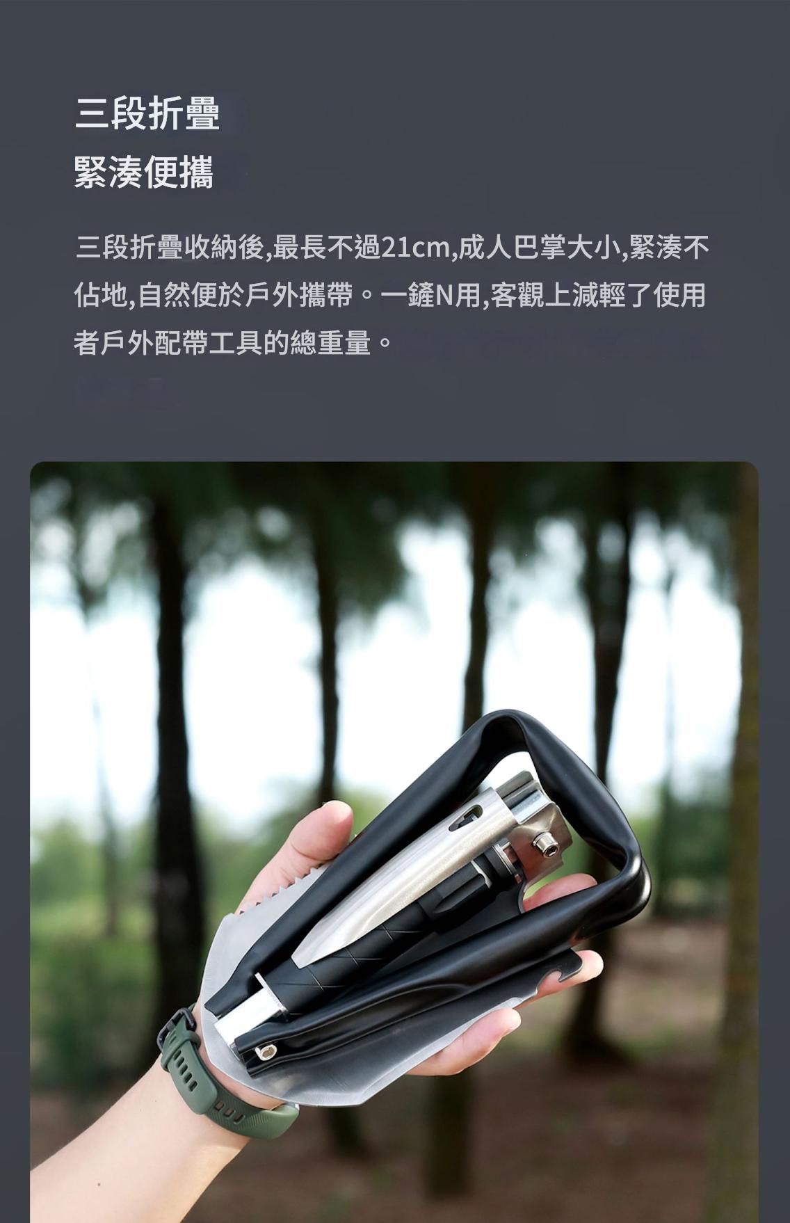 • 功能整合度高:集錘、鏟、鋤、斧頭、刀、鋸六種功能於一體,滿足使用者在露營、釣魚、園藝等多種場景下的使用需求,無需攜帶多種工具。