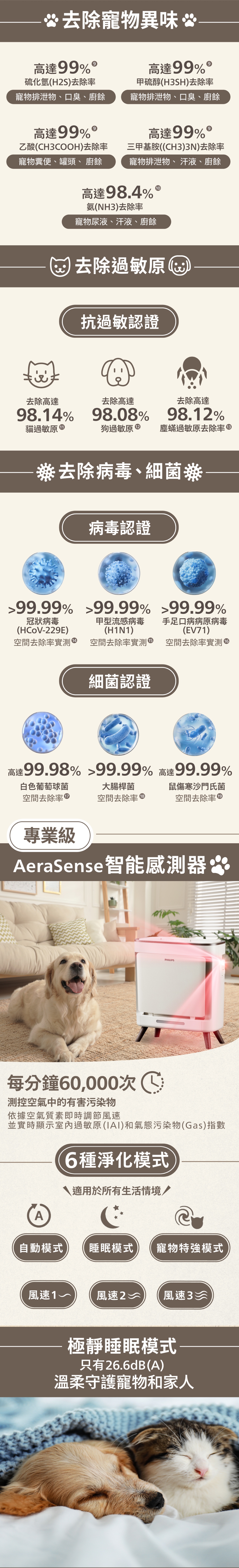 • 高效去除致敏原:搭載消毒及抗過敏呼吸系統,可去除 98% 的貓狗致敏原,降低寵物過敏風險,為養寵家庭營造健康呼吸環境。
