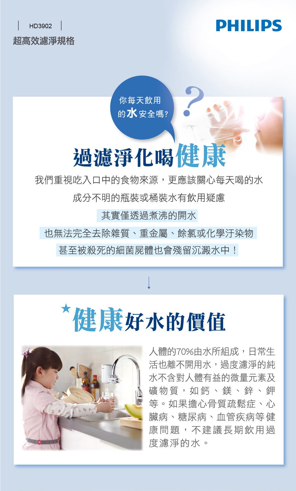 飛利浦 Philips HD3902 濾水芯,4重過濾系統可過濾細菌、寄生蟲、氯氣、臭味及沉澱物。Philips Mineral+ 濾水器的替換濾網去除水中的細菌、有害的有機物質和氯氣,並加入礦物質,確保您能享有美味而健康的清純飲用水。