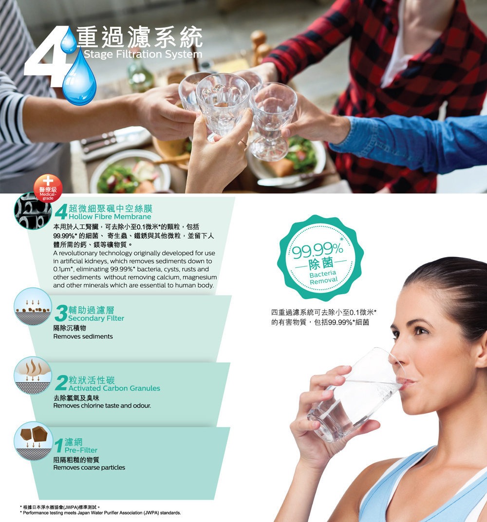 • 4重過濾系統可過濾細菌、寄生蟲、氯氣、臭味及沉澱物