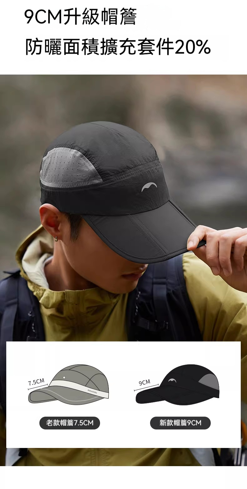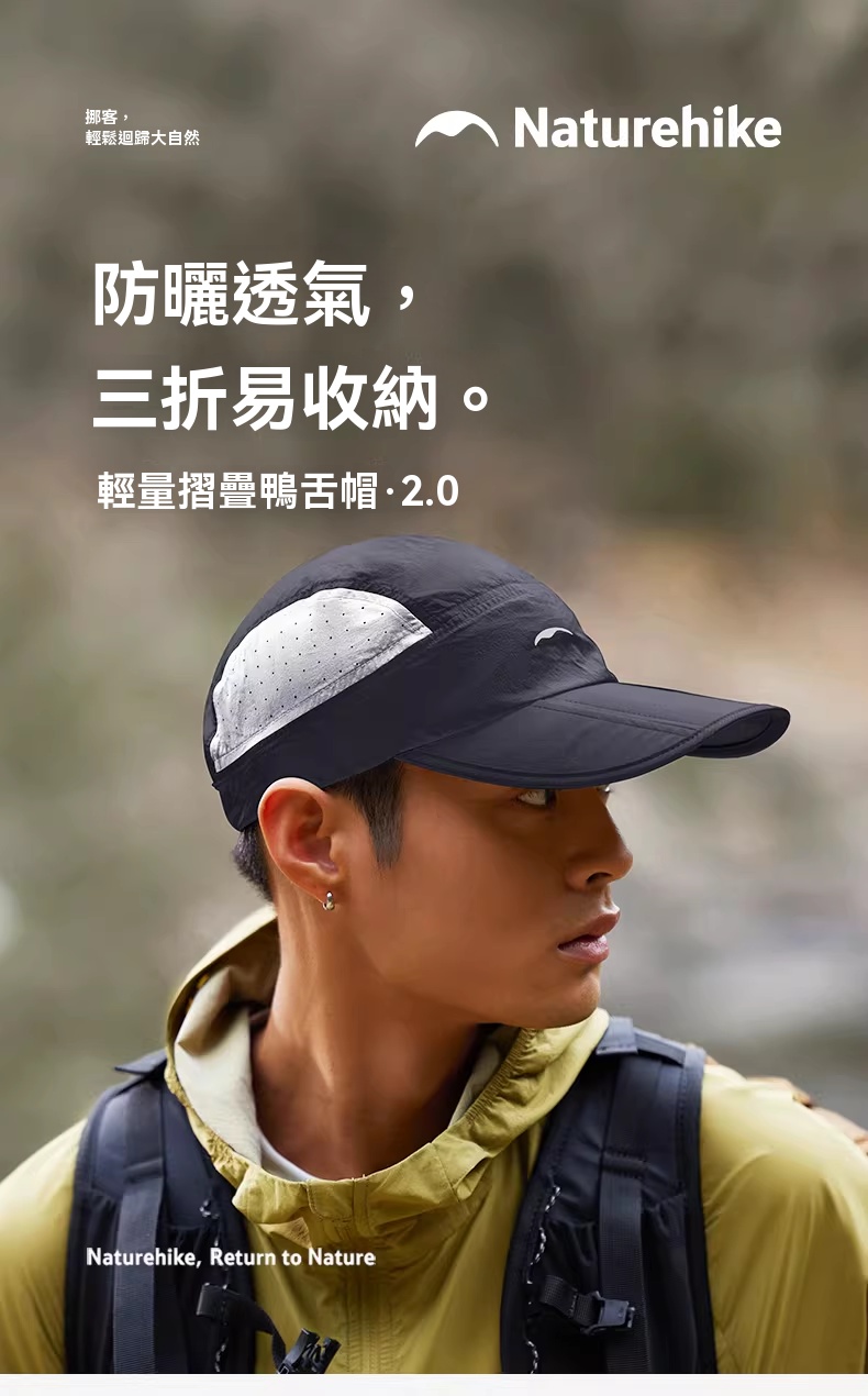 Naturehike 輕量化摺叠防曬鴨舌帽,助你輕鬆回歸自然。採用防曬透氣面料,支援UPF50+高效防曬,阻隔99%紫外線。帽簷加長至9CM,遮陽更全面。重量如一枚雞蛋般輕巧,配備三折系統,便攜易收納,適合露營、徒步、垂釣等多種戶外場景。