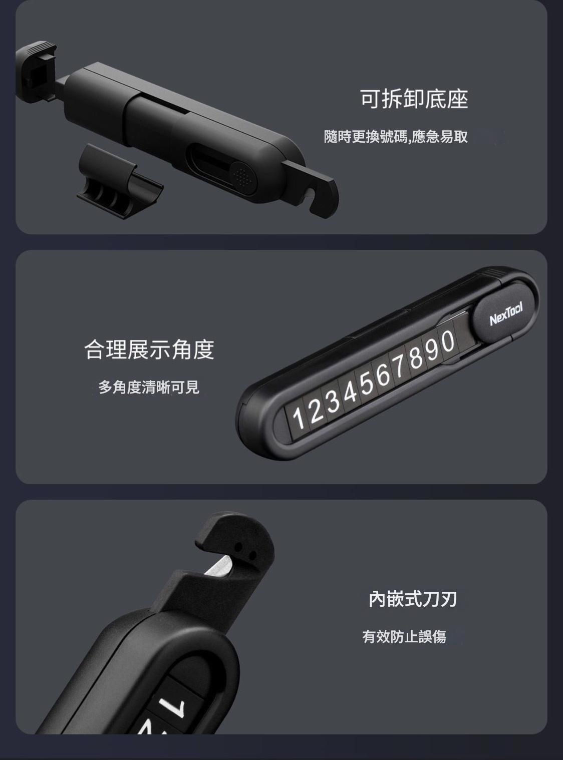 開車出行,停車難題常困擾大家。要是臨時停車,留聯絡方式就成了必須,可普通停車牌又有隱私外洩風險。別擔心,Nextool納拓多功能停車牌來幫你!這款停車牌採用創新設計,號碼可隱藏,需要時輕鬆翻轉展示,有效保護隱私。而且它不僅是停車牌,還融合了多種實用功能,例如緊急破窗器,關鍵時刻能敲碎車窗逃生;隱藏式割繩刀,遇到危險可快速割斷繩索。材質上選用高品質材料,堅固耐用,能適應各種惡劣環境。有了它,停車更安心,出遊更便捷,快入手一個吧!