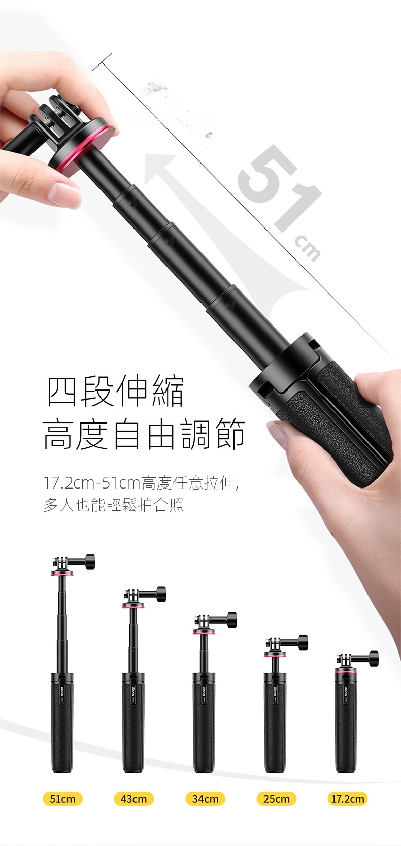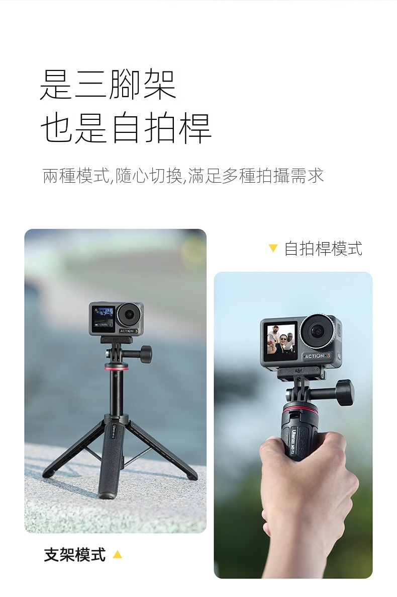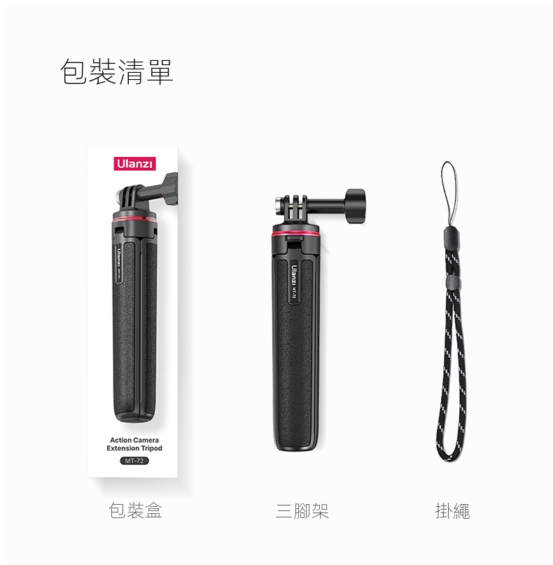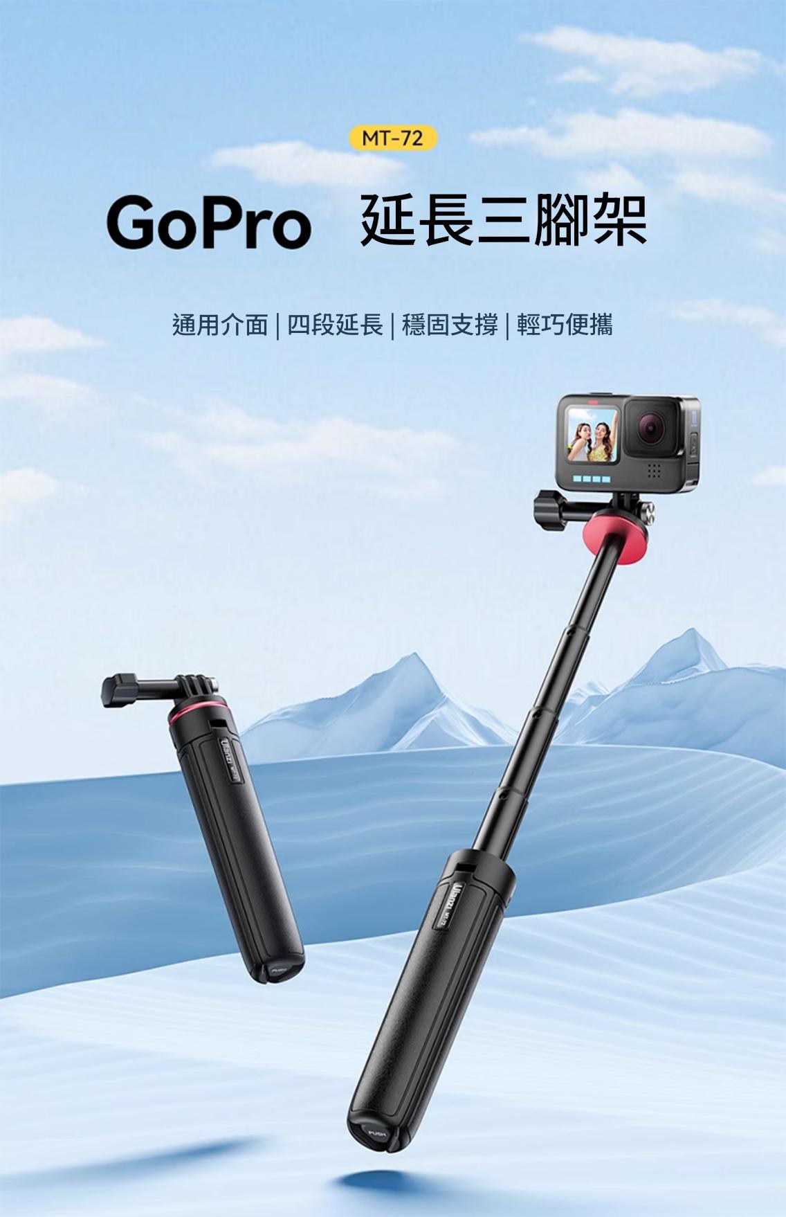 Ulanzi MT-72 延長三腳架是一款專為GoPro及其他運動相機設計的多功能配件,兼具輕便與實用性。其採用四段伸縮設計,高度可從17.2cm調整至51cm,滿足不同場景的拍攝需求,多人合照也輕鬆應對。產品重量僅151g,攜帶無負擔,適合戶外旅行或日常使用。 此三腳架不僅可用作穩定的支架,還可作為自拍杆,兩種模式隨心切換,滿足多樣化的拍攝需求。它擁有廣泛兼容性,適用於市面上大部分運動相機及全景相機,提供靈活的應用選擇。 產品細節方面,防滑手柄和底部的防滑硅膠墊確保握持穩固,三角穩定結構則增強了整體的穩定性。此外,安全掛繩的設計提供了額外的安全保障,防止意外掉落。材質上,尼龍加纖、硅膠和不鏽鋼的結合,保證了耐用性和舒適性。 Ulanzi MT-72 延長三腳架以其輕巧便攜、高度可調、廣泛兼容等優勢,成為攝影愛好者和戶外活動人士的理想選擇。