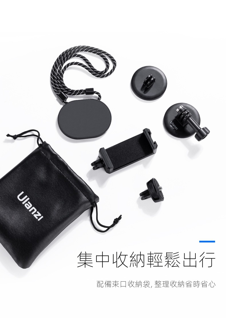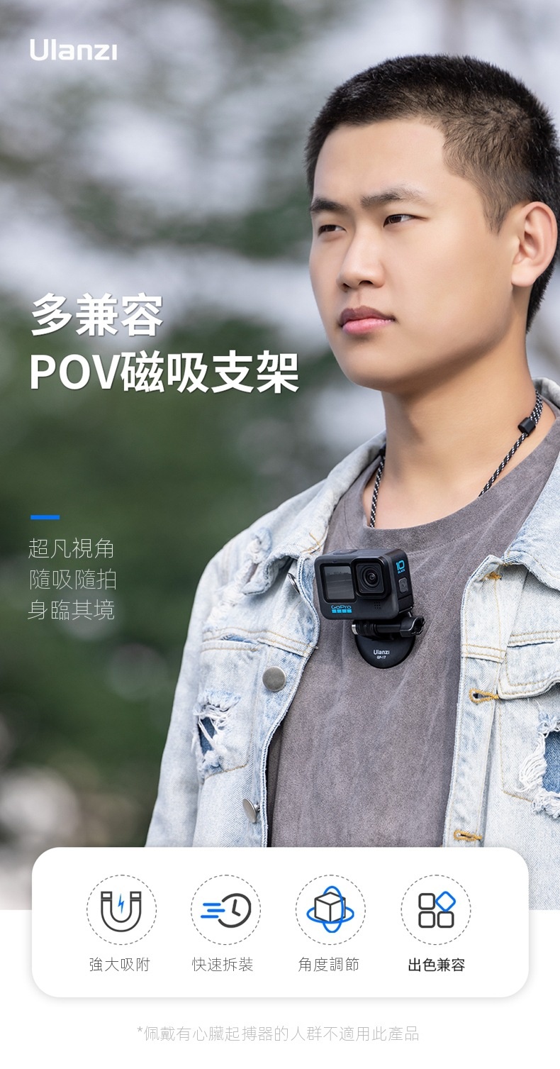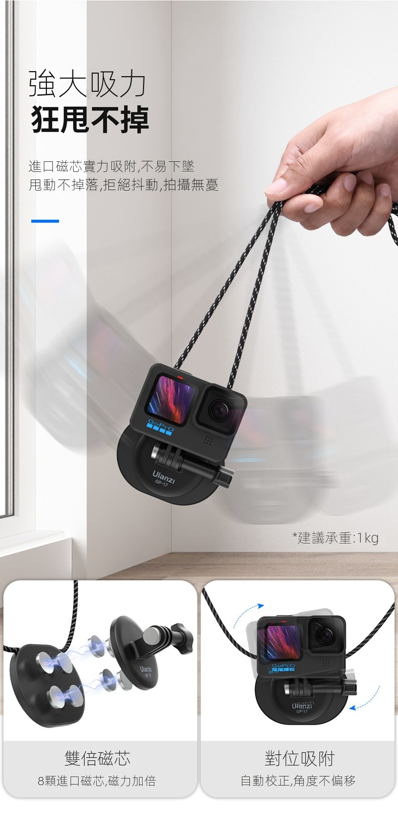 Ulanzi GP-17 GoPro第一人稱磁吸支架,是拍攝第一人稱視角影像的得力助手。它採用高強度磁鐵的磁吸設計,最大靜吸引力達20N,安裝便捷,可吸附在汽車、貨架等金屬表面,穩定耐用。配備GoPro轉1/4''介面轉接器,相容性強,適用於GoPro全系列、大疆Osmo Action、Insta360 X3/2及其他運動相機,還能連接手機拍攝。連結部位角度可調節,無論是健行、運動,或是購物、烹飪等場景,都能滿足拍攝需求。支架僅重115g,尺寸小巧,搭配掛繩方便攜帶與防丟失,為你的創意拍攝帶來諸多便利 。