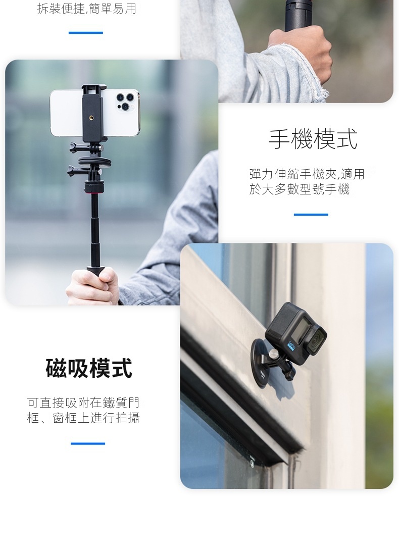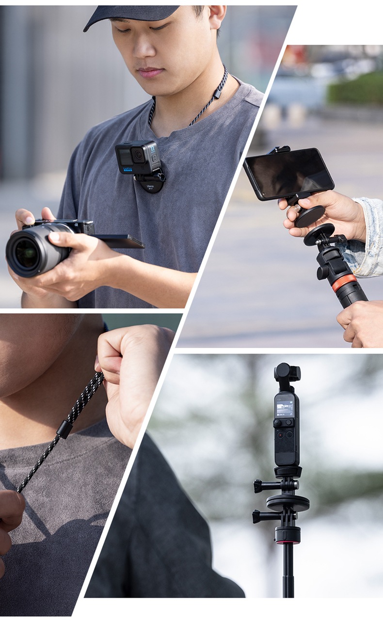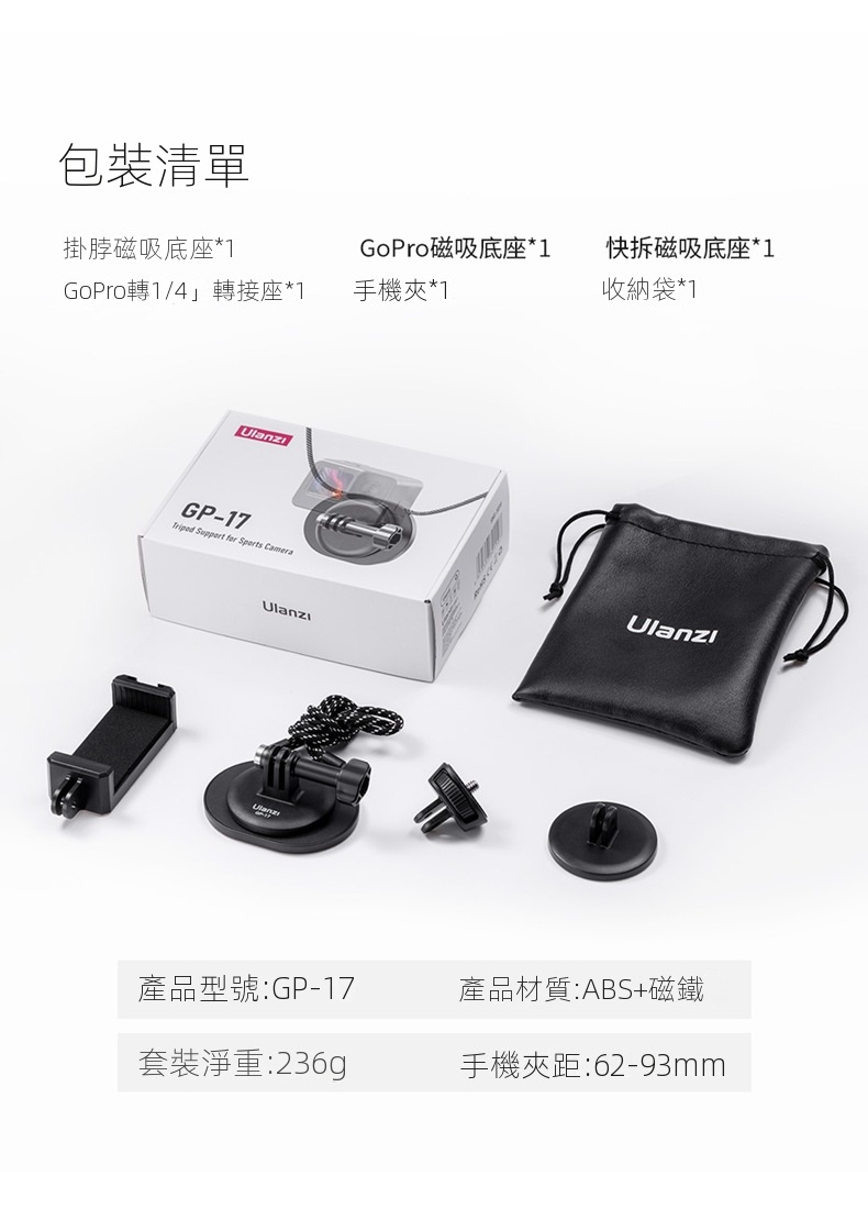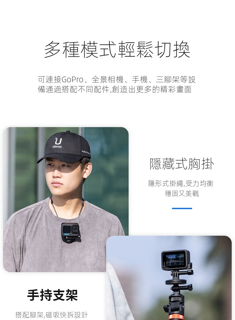 Ulanzi GP-17 GoPro第一人稱磁吸支架,是拍攝第一人稱視角影像的得力助手。它採用高強度磁鐵的磁吸設計,最大靜吸引力達20N,安裝便捷,可吸附在汽車、貨架等金屬表面,穩定耐用。配備GoPro轉1/4''介面轉接器,相容性強,適用於GoPro全系列、大疆Osmo Action、Insta360 X3/2及其他運動相機,還能連接手機拍攝。連結部位角度可調節,無論是健行、運動,或是購物、烹飪等場景,都能滿足拍攝需求。支架僅重115g,尺寸小巧,搭配掛繩方便攜帶與防丟失,為你的創意拍攝帶來諸多便利 。