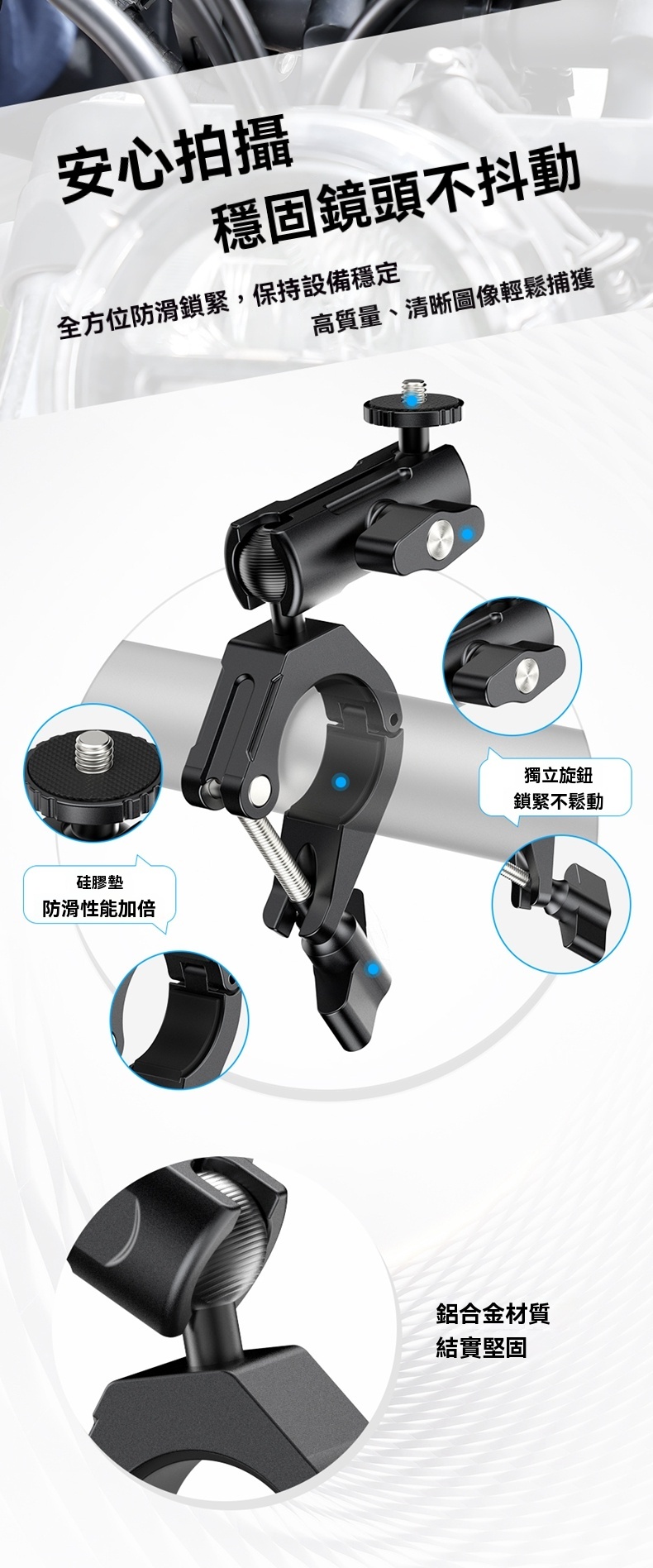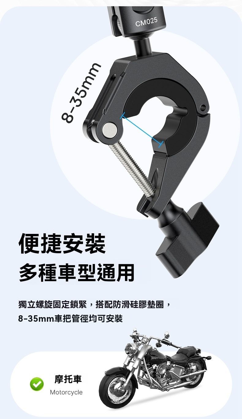 這款Ulanzi CM025自行車/電動車專用運動相機支架,為騎行愛好者帶來穩定且靈活的拍攝體驗。採用高品質鋁合金材質,結構堅固耐用,確保在高速騎行中相機穩如泰山,不會抖動。獨特設計的獨立旋鈕和防滑矽膠墊圈,讓安裝過程變得簡單快捷,適用於8-35mm的車把管徑,相容於多種車型。 支架配備萬向球頭,可實現360°雙向靈活調節,滿足不同角度的拍攝需求,輕鬆捕捉第一人稱視角(POV)或廣闊風景。同時,它還配有GoPro適配器,方便快速安裝各種運動相機,即刻開拍。此外,附帶的備用螺帽和矽膠墊圈,進一步提升使用便利性與穩定性。無論是自行車還是電動車,這款支架都能提供專業級的拍攝體驗,讓您盡情享受騎行與攝影的樂趣。