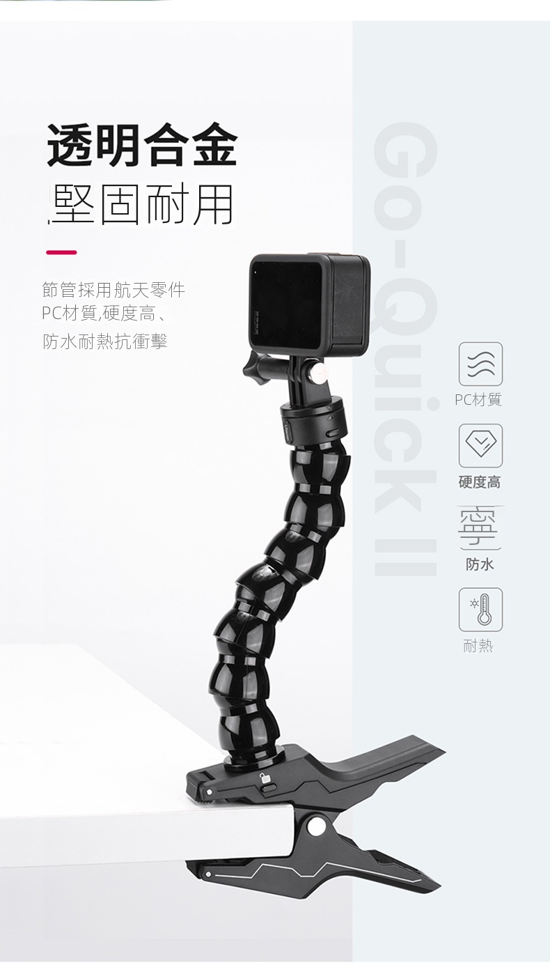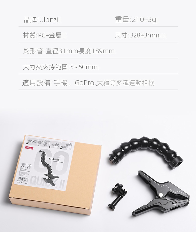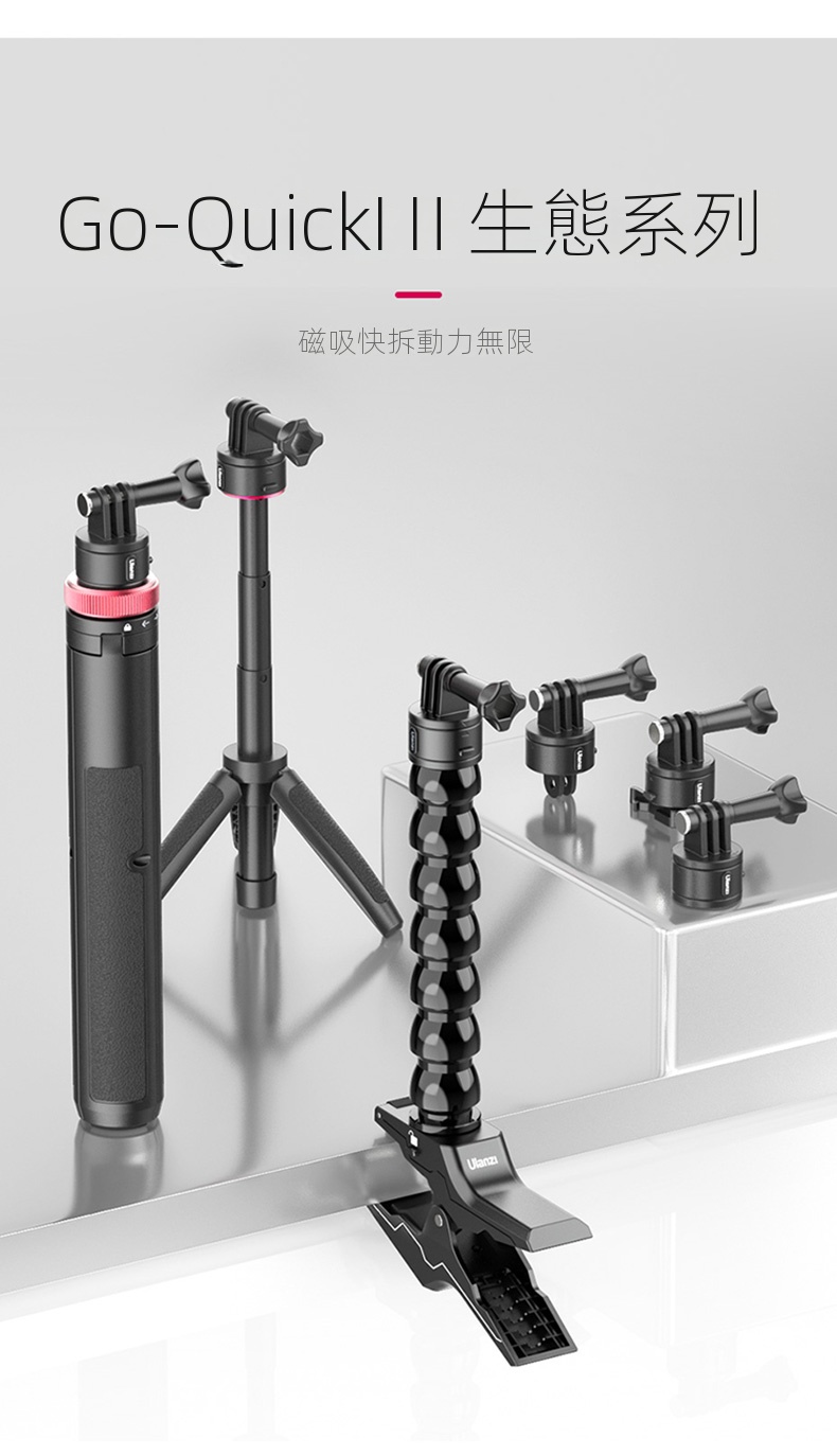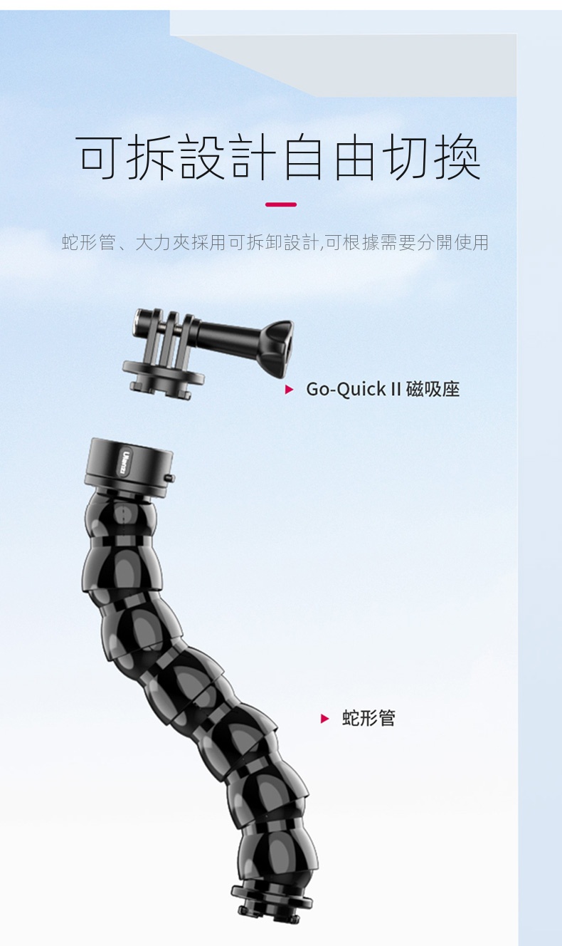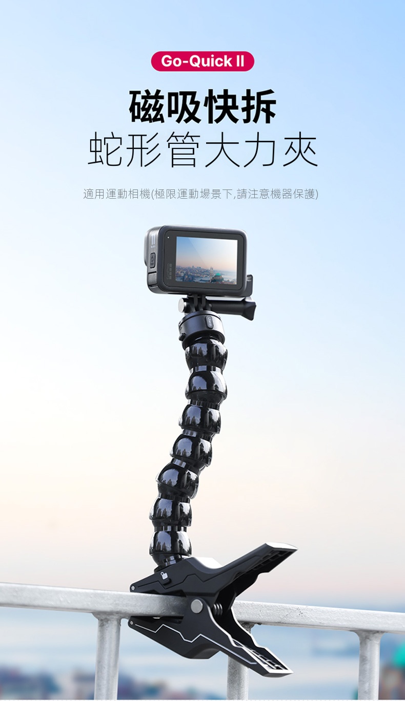 Ulanzi Go-Quick II蛇形管快拆大力夾,是攝影愛好者的實用利器。它採用強力磁吸快拆設計,一卡一扭即可快速安裝,大大節省拍攝準備時間。大力夾的夾持力強勁,可牢固固定在多種物體上,無懼顛簸震動。內建強韌柔性鋁材的蛇形管,可輕鬆拗出各種造型,自由調整拍攝角度。無論是記錄戶外運動,或是用於日常Vlog創作,它都能適配GoPro、大疆等主流運動相機,滿足多樣化拍攝需求,助你捕捉每個精彩瞬間 。