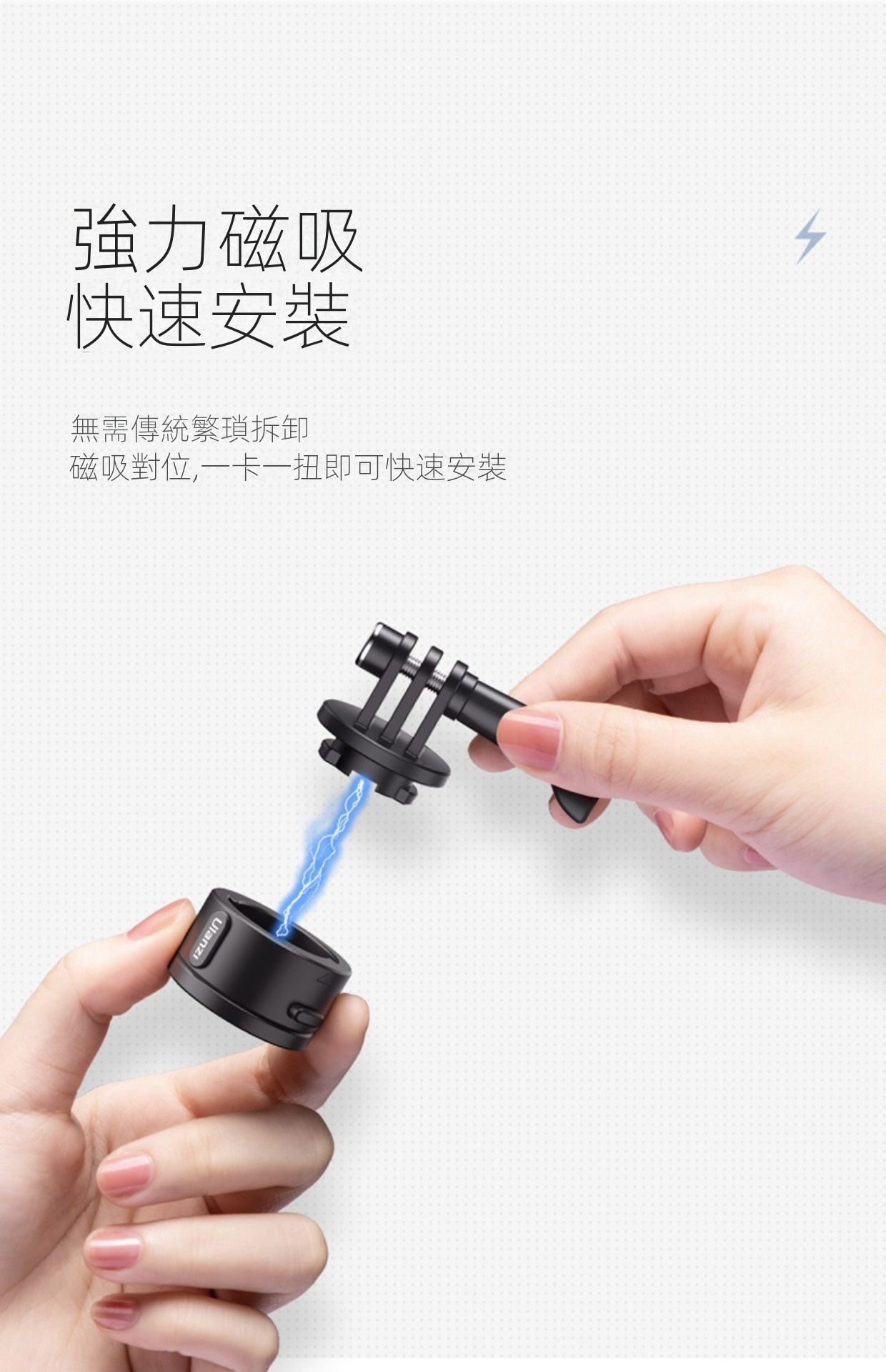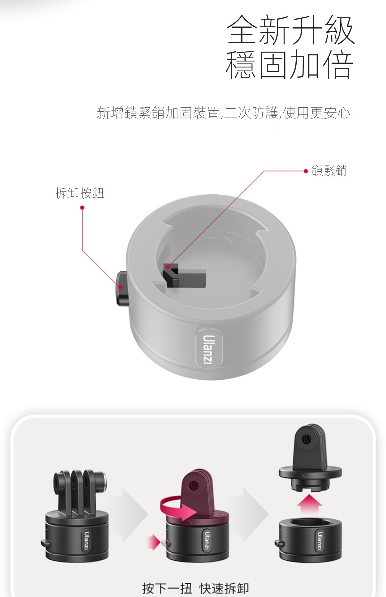 Ulanzi Go-Quick II磁吸快拆基礎套裝,專為運動攝影機拍攝愛好者打造。套件內含有3款產品、共5個配件,能將常規的1/4接口、GoPro接口轉為快拆接口 ,輕鬆適配GoPro、大疆、insta360等主流運動相機。安裝時,強力磁吸對位,一卡一扭即可快速安裝,無需繁瑣拆卸過程,省時又省力。而且這套組合穩固性強,全新升級的鎖緊銷加固裝置,提供二次防護,讓相機在拍攝時安全無虞,高效滿足多場景拍攝需求 。