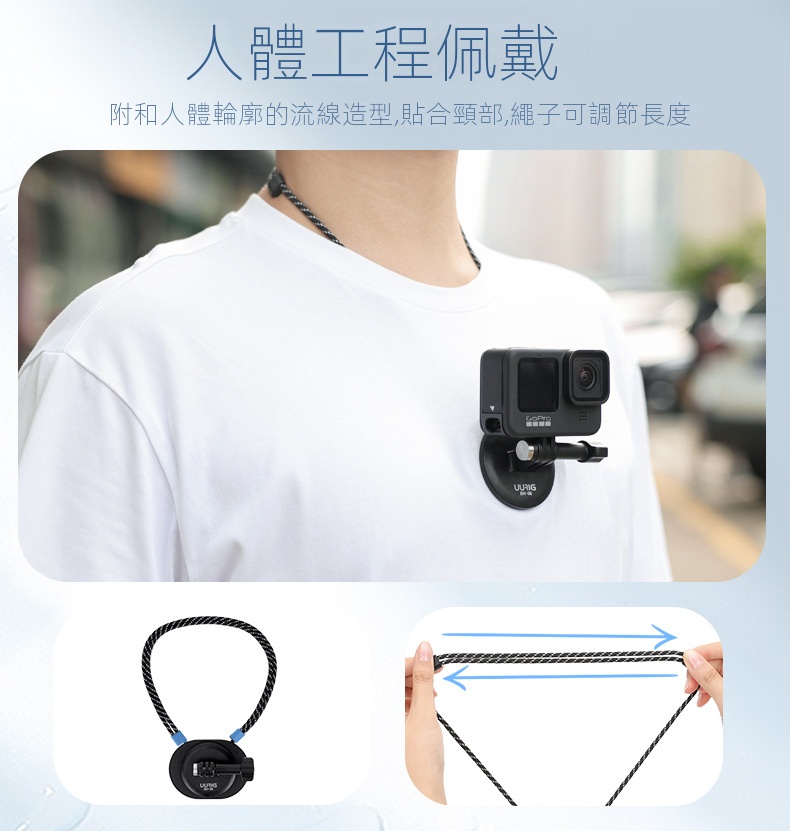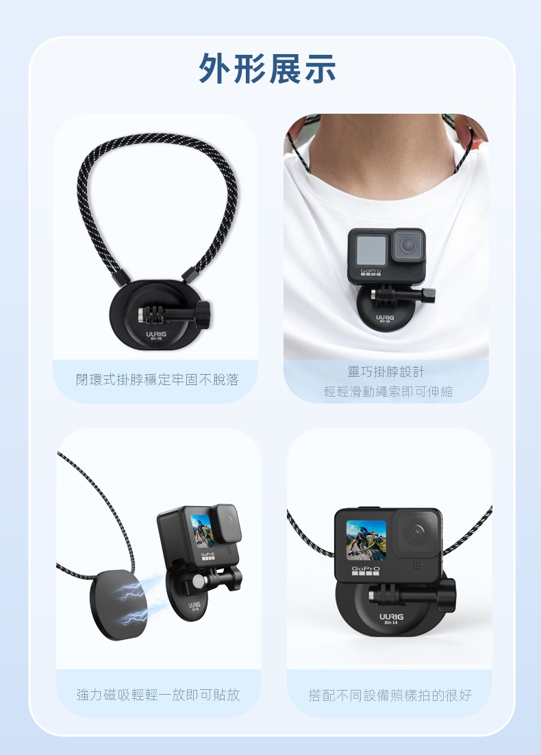 UURIG BH14運動相機掛脖架,採用強力磁吸設計,靜止吸附承重達50N。靈巧的掛脖設計,貼合頸部,繩子可調節長度,確保穩定不脱落。支援多角度調整,解放雙手,滿足各種拍攝需求,無論橫拍或豎拍皆得心應手,帶來極致POV視覺體驗,是戶外運動的理想選擇。