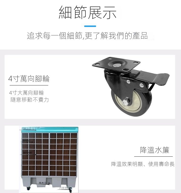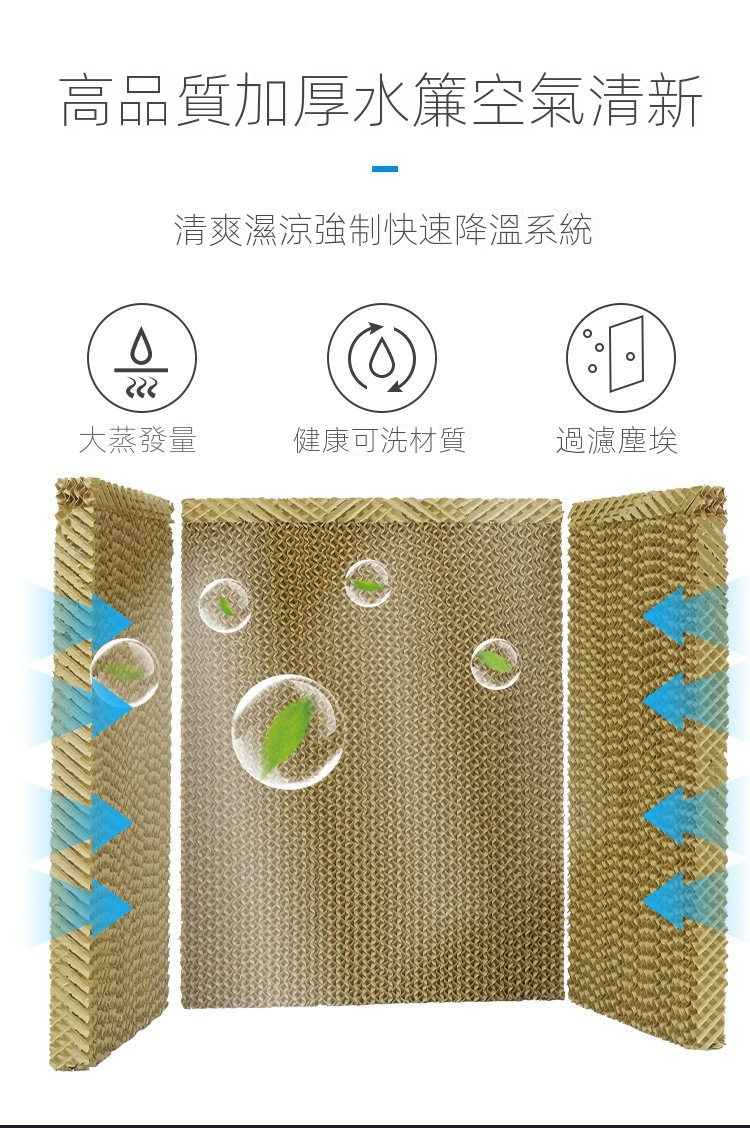 • 高品質加厚水簾,空氣清新,強制快速降溫系統,大蒸發量健康可洗材質過濾塵埃