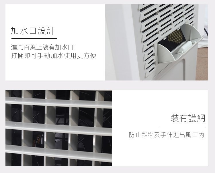 • 加水口設計:進風百葉上裝有加水口,打開即可手動加水,使用更方便,裝有護網防止雜物及手伸進出風口內