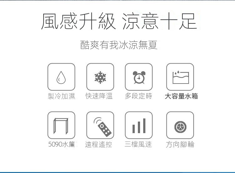 • 風感升級,涼意十足,製冷加濕快速降溫