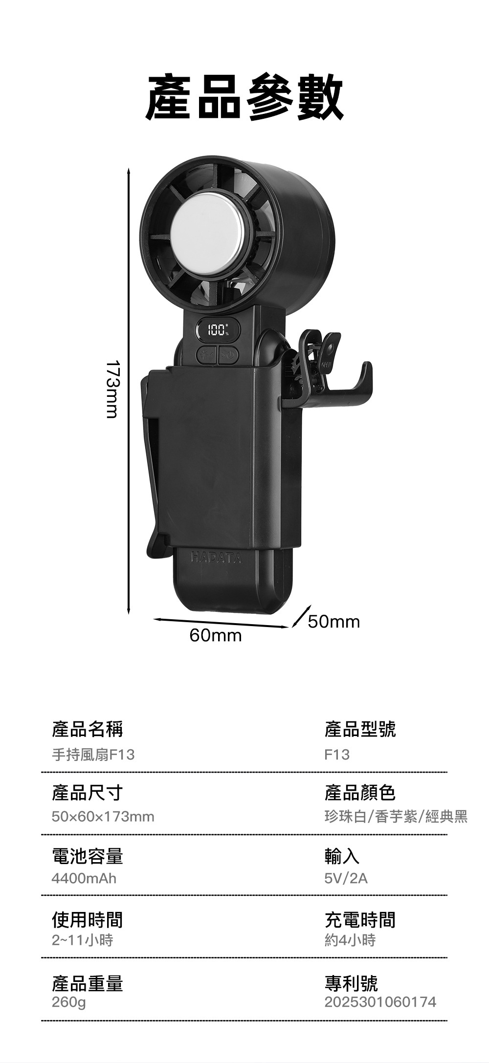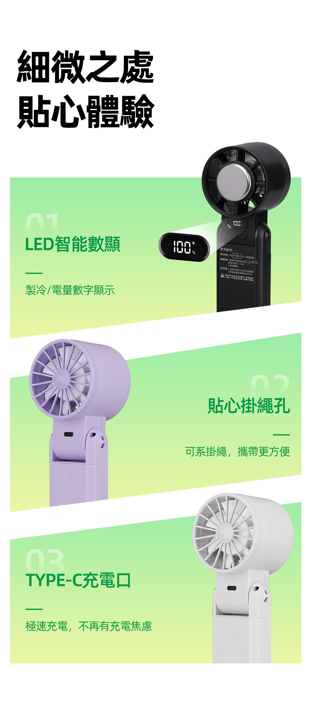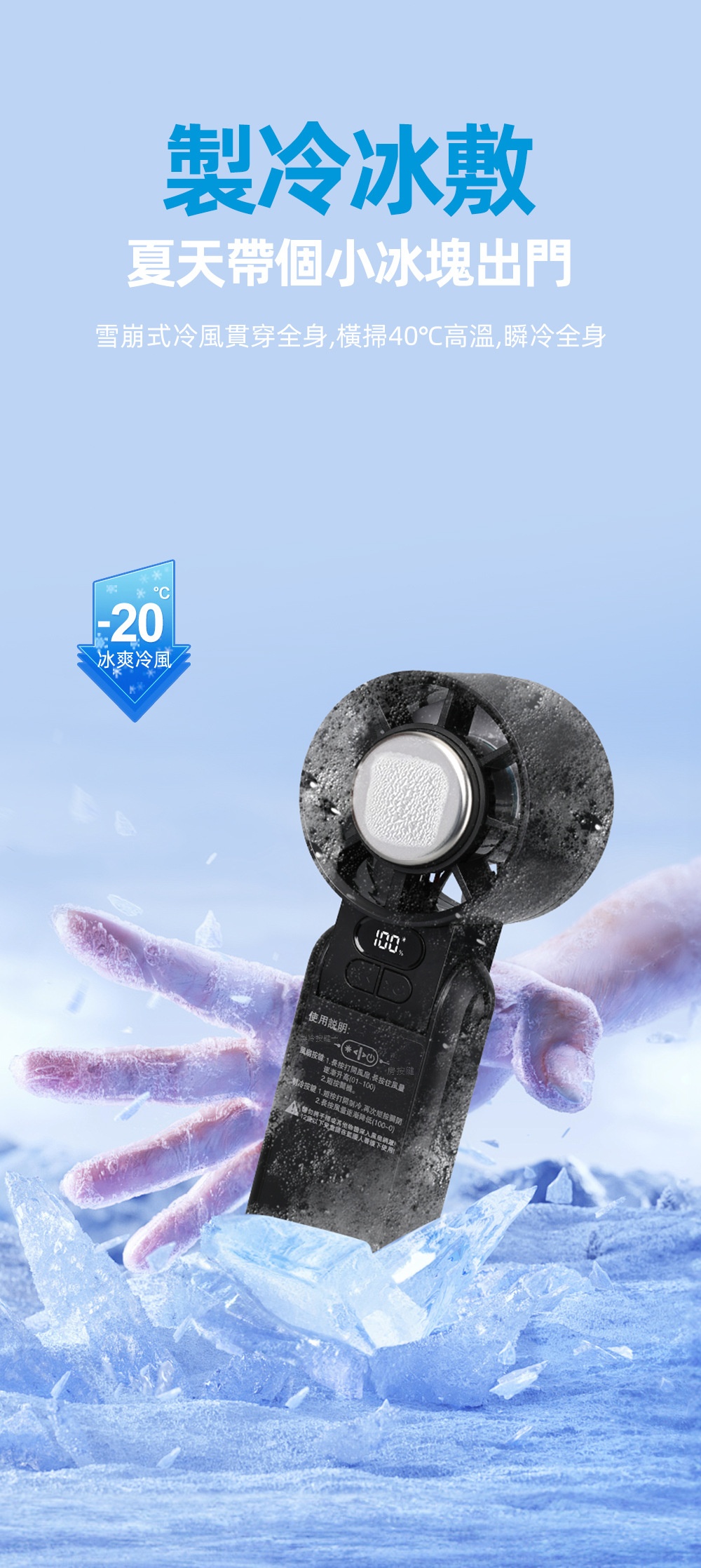 夏日酷熱,HADATA F13製冷冰感手持迷你風扇來解救你!它小巧便攜,輕鬆裝入口袋或握在手中。採用TEC超導冷鋁製冷,開機迅速降溫至16℃,開啟冷氣模式,吹出的風冰爽宜人,中間製冷片還能用於冰敷,暴曬後貼臉瞬間降溫。具備1 - 100檔無段變速,搭配高速吹風機類風道設計,高速馬達轉速達13000轉/分鐘,風速最高8米/秒,輕鬆吹散戶外悶熱。內建5200mAh超大電量,滿電可續航20小時,LED智慧螢幕即時顯示電量與風速,讓你對風扇狀態一目了然。