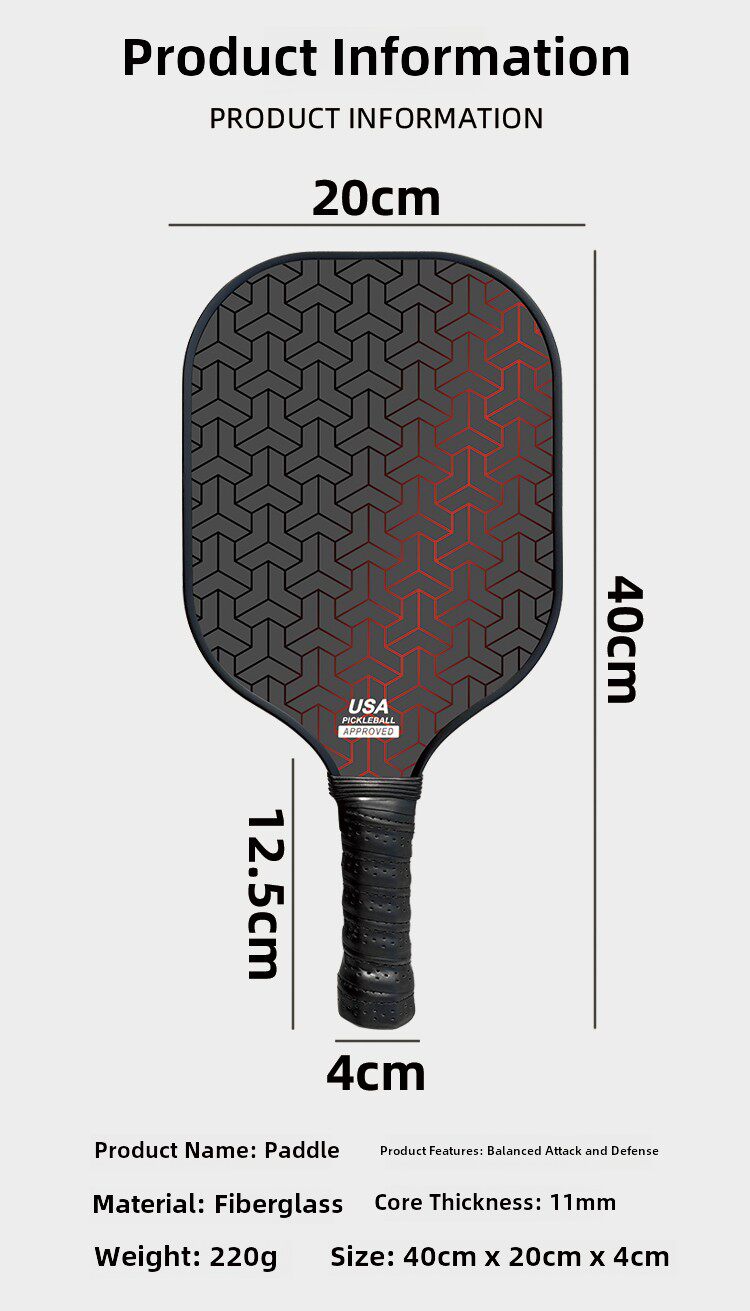 專業級玻璃纖維輕量化匹克球拍,專為追求精準控制與藝術揮拍的選手設計。球拍採用玻璃纖維材料打造,輕盈、堅固且靈動如風,重量僅220克,能有效減輕手臂負擔。其超大拍面與擴大甜區設計,確保擊球時提供最佳回彈與精確控制,讓每一次觸球都如同藝術家在畫布上作畫。核心採用蜂窩結構,強度高且穩定,配合空氣動力學設計,使每次揮拍都充滿熱情與可能。握柄配備優質防滑膠帶,提供舒適手感並防止滑脫。拍框邊緣經強化處理,圓角設計搭配高質量保護,耐用且能防止碰撞損害。該球拍通過美國匹克球官方認證,尺寸為長27公分、寬20公分,是平衡攻守的專業首選。