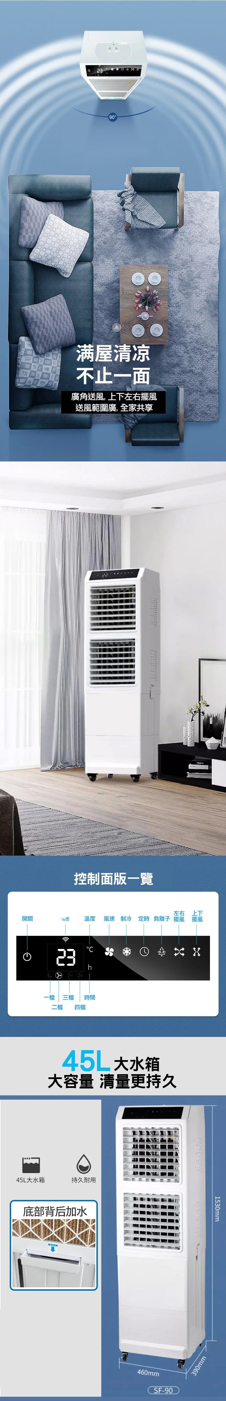 HAOAYOU SF-90 大型智慧冷風機採用蒸發空氣冷原理,兼具抗菌、除臭功效,讓空間時刻保持清新涼爽。機身尺寸 460 (w) x390 (d) x1530 (h) mm,搭載 45L 大容量水箱,支援底部背後加水,續航力無須頻繁補水。配備 Wi-Fi 智慧控制,搭配 4 檔風速調整與定時功能,操作便利隨心。 90° 廣角送風能上下左右擺風,風距達 5-12m/s,最高風量 5000m³/h,30-50m³ 空間全覆蓋。負離了加濕淨化合一,兼顧清涼與健康,適配 220VAC/50Hz 電壓、300W 功率,無論是家居日常使用,還是餐廳、醫院、超市等商用場景都能輕鬆勝任,全家共享廣域舒適涼風。