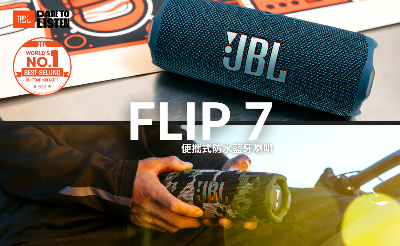 JBL Flip 7 是一款兼具強勁音效與耐用性的便攜式喇叭,搭載經典 JBL Pro Sound 併升級 AI Sound Boost 技術,可實時分析音樂優化輸出,配合全新高音震膜設計,呈現清晰高頻與深沉低音,失真更低。它支援 Bluetooth 5.4 連接,穩定性更強,還可透過 Auracast™ 串聯多台相容喇叭,輕鬆打造立體聲或全域音效。續航力可達 14 小時,開啟 Playtime Boost 還能延長 2 小時,滿足全天使用需求。配備 IP68 防水防塵認證,可承受 1.5 公尺水深浸泡 30 分鐘,且能抵抗 1 公尺高度掉落。全新 PushLock 系統搭配登山扣與腕帶,方便隨身攜帶,是戶外與日常的理想音樂伴侶。