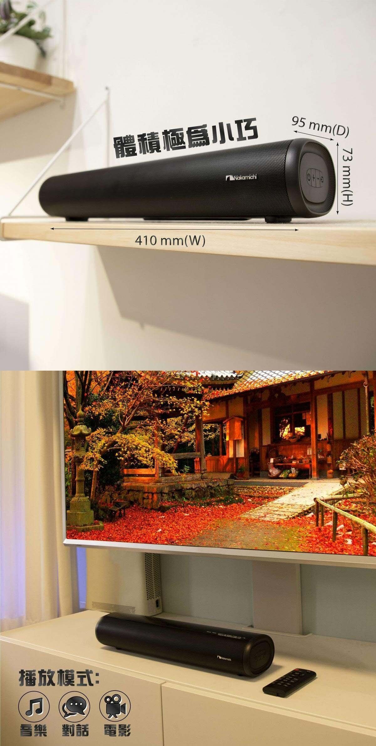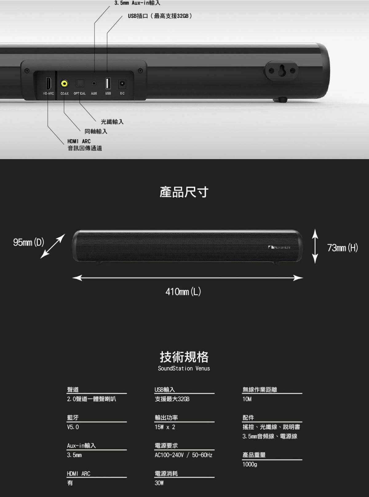 NAKAMICHI SoundStation Venus 2.0 聲道 Mini Soundbar,產地為中國,體積極緻小巧,尺寸為 410mm×95mm×73mm(長 × 深 × 高),重 1000g,支援掛牆或座台式擺放,靈活適配家中角落,尤其適合小空間。它配備一對 15W 全頻單元,輸出功率 15W×2,具有虛擬環繞音效及擴散感,還預設音樂、電影、對話三種播放模式,可按需切換。連接方式豐富,支援藍牙 5.0、NFC 無線音樂播放,以及 3.5mm 外置音源、USB(最大支援 32GB)、同軸 / 光纖、HDMI ARC 等多種輸入 / 輸出方式,安裝無需裝修和額外佈線,十分便捷。
