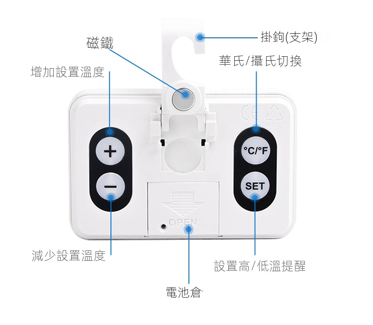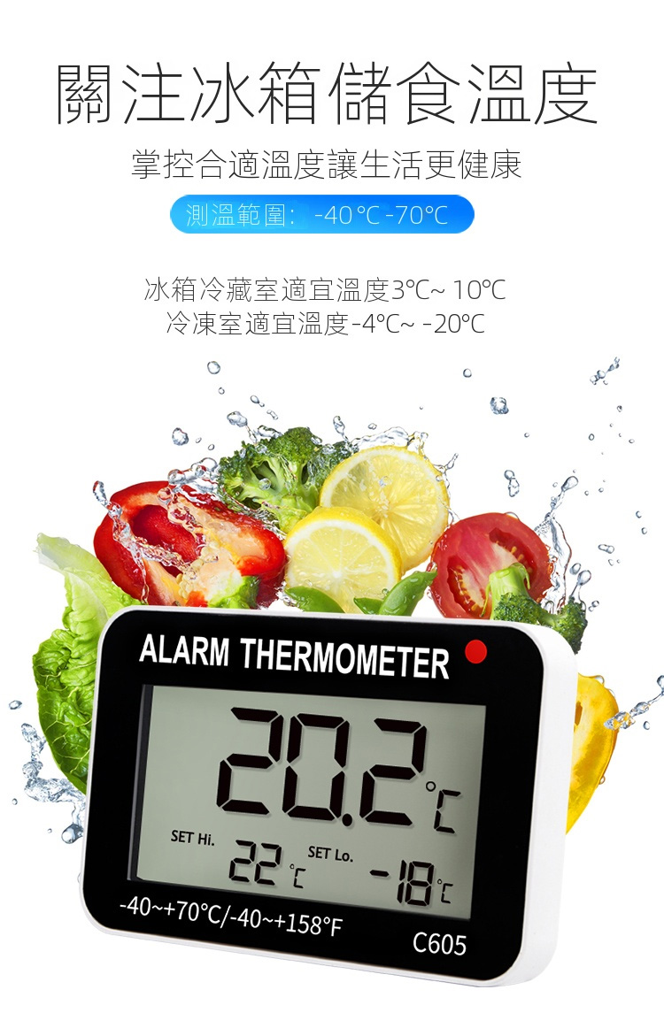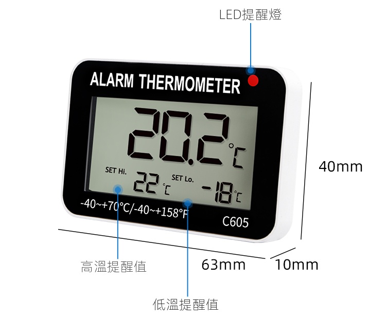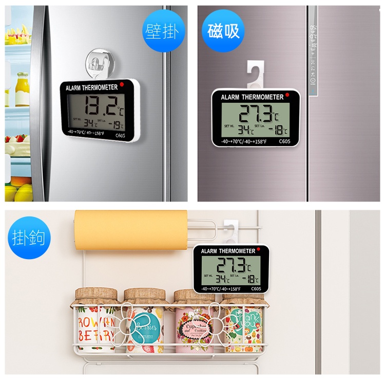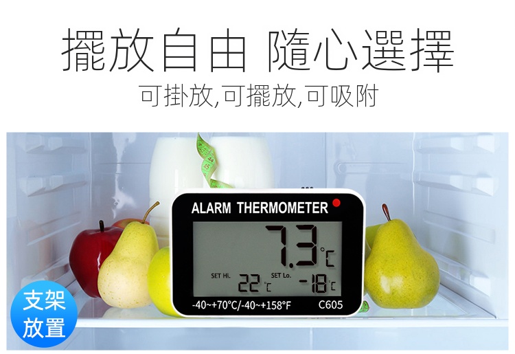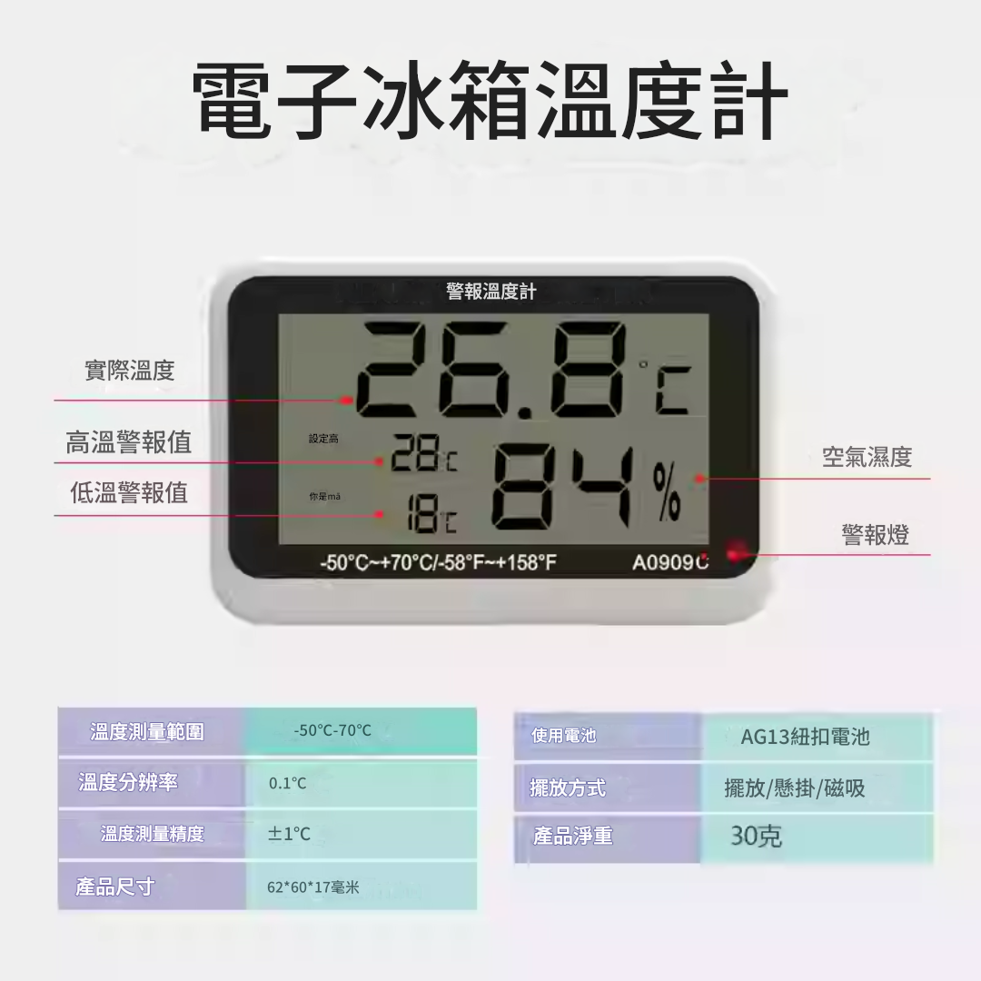 三印 A0909C 電子警報冰箱溫度計,精準測量冰箱、冷櫃等低溫環境的溫濕度,方便用戶隨時掌握冰箱內部環境。具備報警功能,可在溫度超出安全範圍時發出警示,確保食品新鮮。可立可掛設計,擺放靈活,是您溫控管理的好幫手。