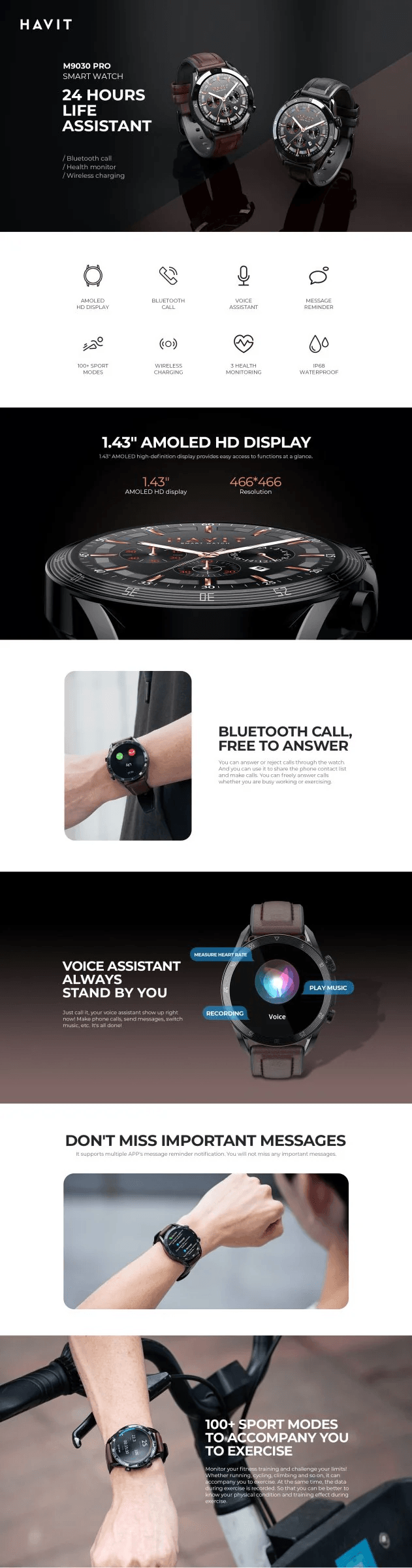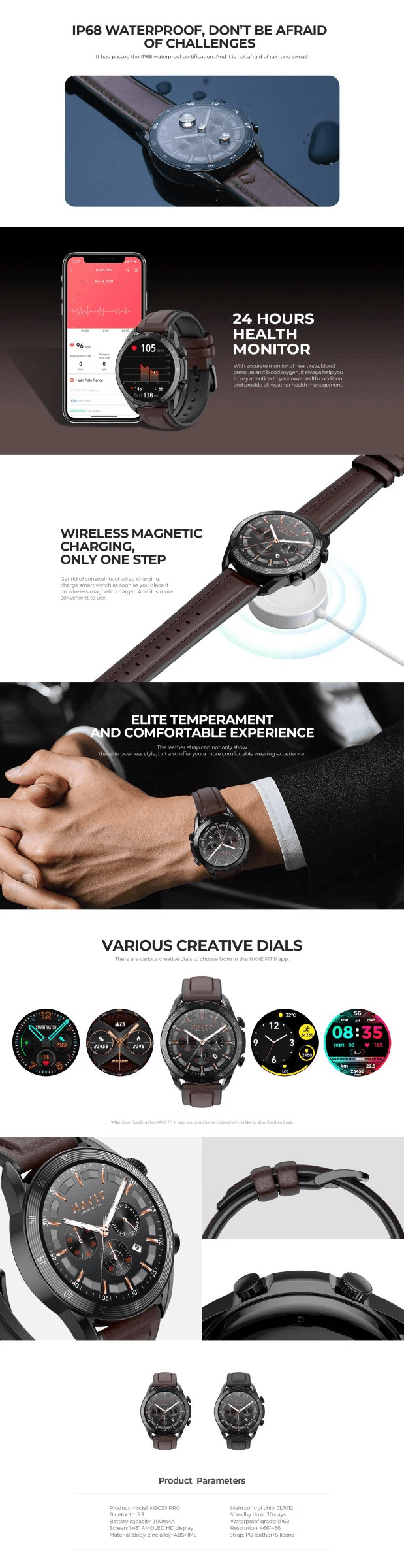 HAVIT M9030 PRO 專業版智慧手錶搭載 1.43 吋 AMOLED 高清顯示屏,466*466 高解析度帶來清晰視覺體驗,功能操作一目了然。支援藍牙 5.3 連接,不僅能接打電話、分享手機聯絡人,語音助理還可快速實現撥號、發消息、切換音樂等操作,多 APP 訊息提醒確保不漏重要資訊。內嵌 100 + 運動模式,覆蓋跑步、騎乘、登山等場景,即時記錄運動數據,搭配 IP68 防水等級,不畏雨水與汗水侵蝕。 24 小時健康監測功能,精準追蹤心率、血壓、血氧數據,提供全天候健康管理。配備 300mAh 電池,待機時間長達 30 天,無線磁吸充電設計擺脫線束束縛。機身採用鋅合金 + ABS+IML 材質,PU 皮革與矽膠錶帶兼具商務質感與配戴舒適度,HAVE FIT II app 內多種創意錶盤可自由下載更換。